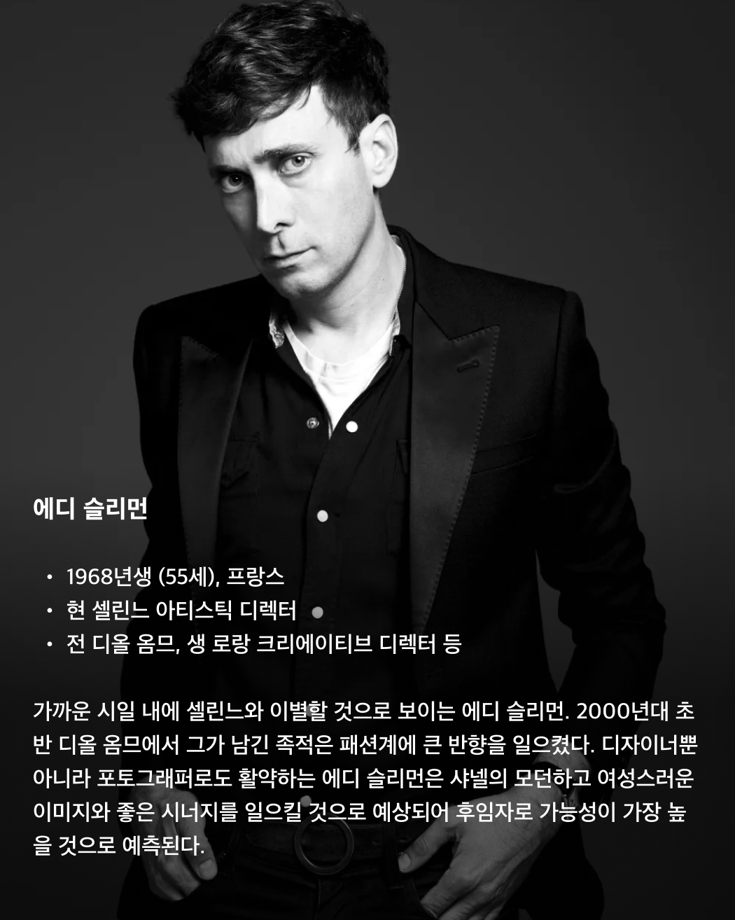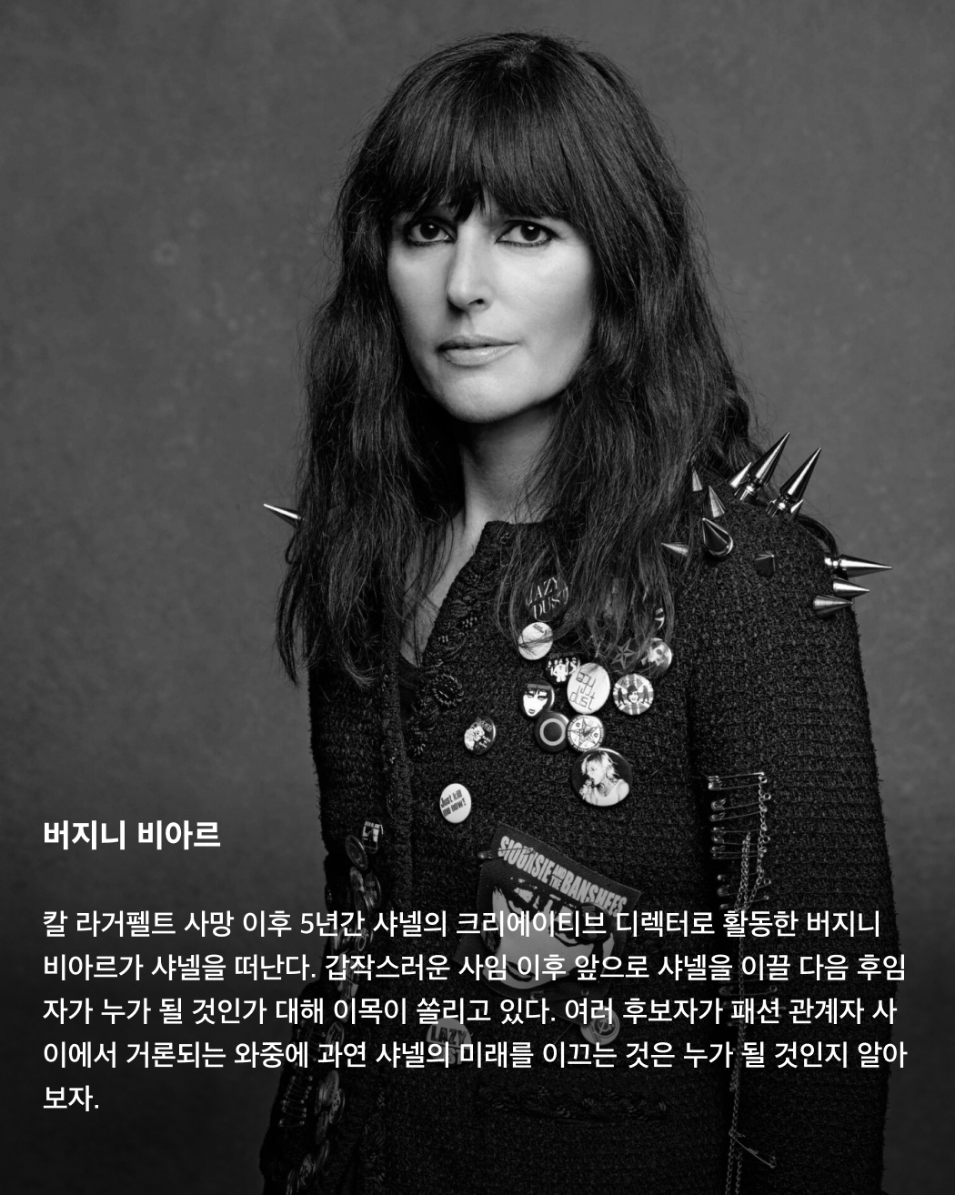 칼 라거펠트가 사망한 이후 5년간 샤넬을 이끌어온 버지니 비아르가 크리에이티브 디렉터 자리에서 사임했습니다. 칼 라거펠트의 오른팔이자 왼팔로 30년 이상 그와 함께 일했던 버지니 비아르가 샤넬을 떠나자, 누가 그 후임자가 될지 이목이 쏠리고 있는데요. 여러 패션하우스에서 크리에이티브 디렉터로 활동했으나 현재는 행선지가 정해지지 않은 여러 디자이너, 샤넬과 어울리는 디자인 스타일을 가진 디자이너 등 여러 후보자가 그 후임으로 거론되고 있죠. 과연 샤넬의 미래를 이끌게 될 디자이너는 누가 될까요? 슬라이드로 확인해 보세요!✅ 이미지3