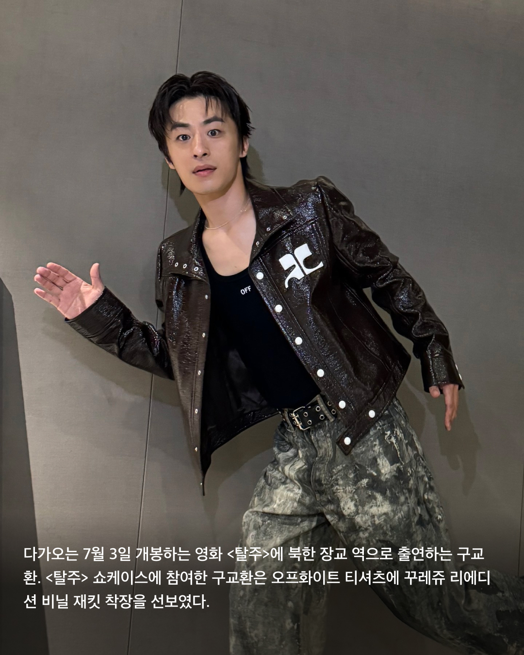 다가오는 7월 3일 개봉하는 영화 <탈주>에 북한 장교 역으로 출연하는 구교환. <탈주> 쇼케이스에 참여한 구교환은 오프화이트 티셔츠에 꾸레쥬 리에디션 비닐 재킷 착장을 선보였다.
