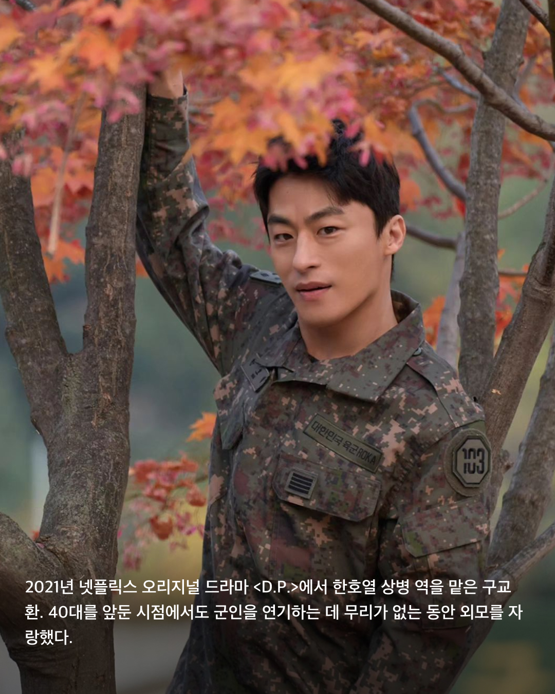 2021년 넷플릭스 오리지널 드라마 <D.P.>에서 한호열 상병 역을 맡은 구교환. 40대를 앞둔 시점에서도 군인을 연기하는 데 무리가 없는 동안 외모를 자랑했다.
