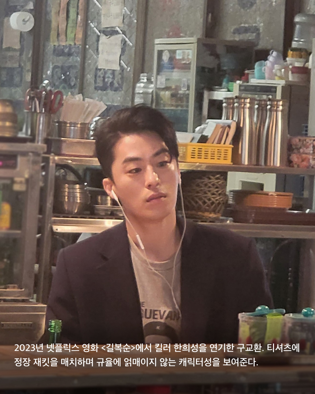 2023년 넷플릭스 영화 <길복순>에서 킬러 한희성을 연기한 구교환. 티셔츠에 정장 재킷을 매치하며 규율에 얽매이지 않는 캐릭터성을 보여준다. 이미지5