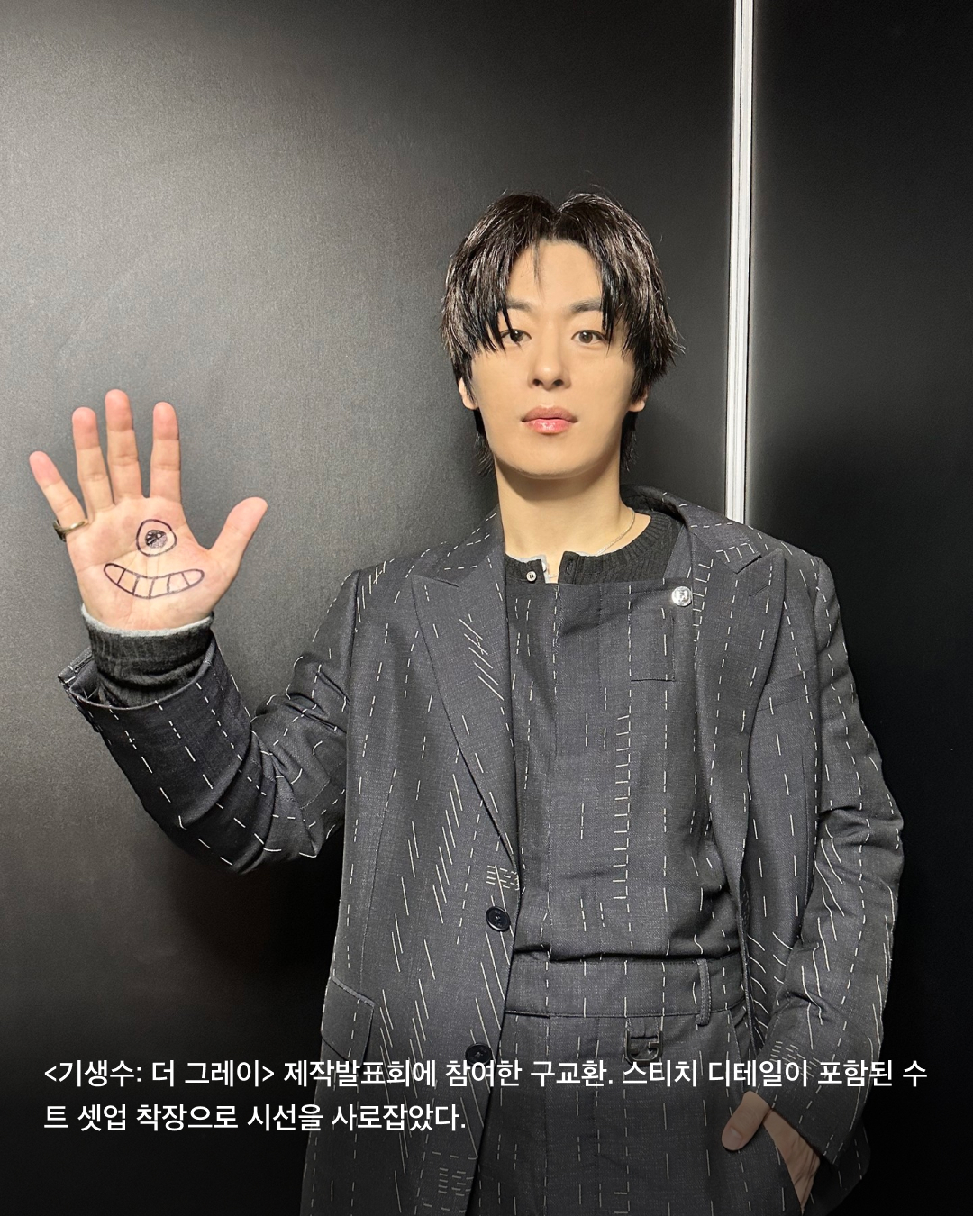 <기생수: 더 그레이> 제작발표회에 참여한 구교환. 스티치 디테일이 포함된 수트 셋업 착장으로 시선을 사로잡았다.