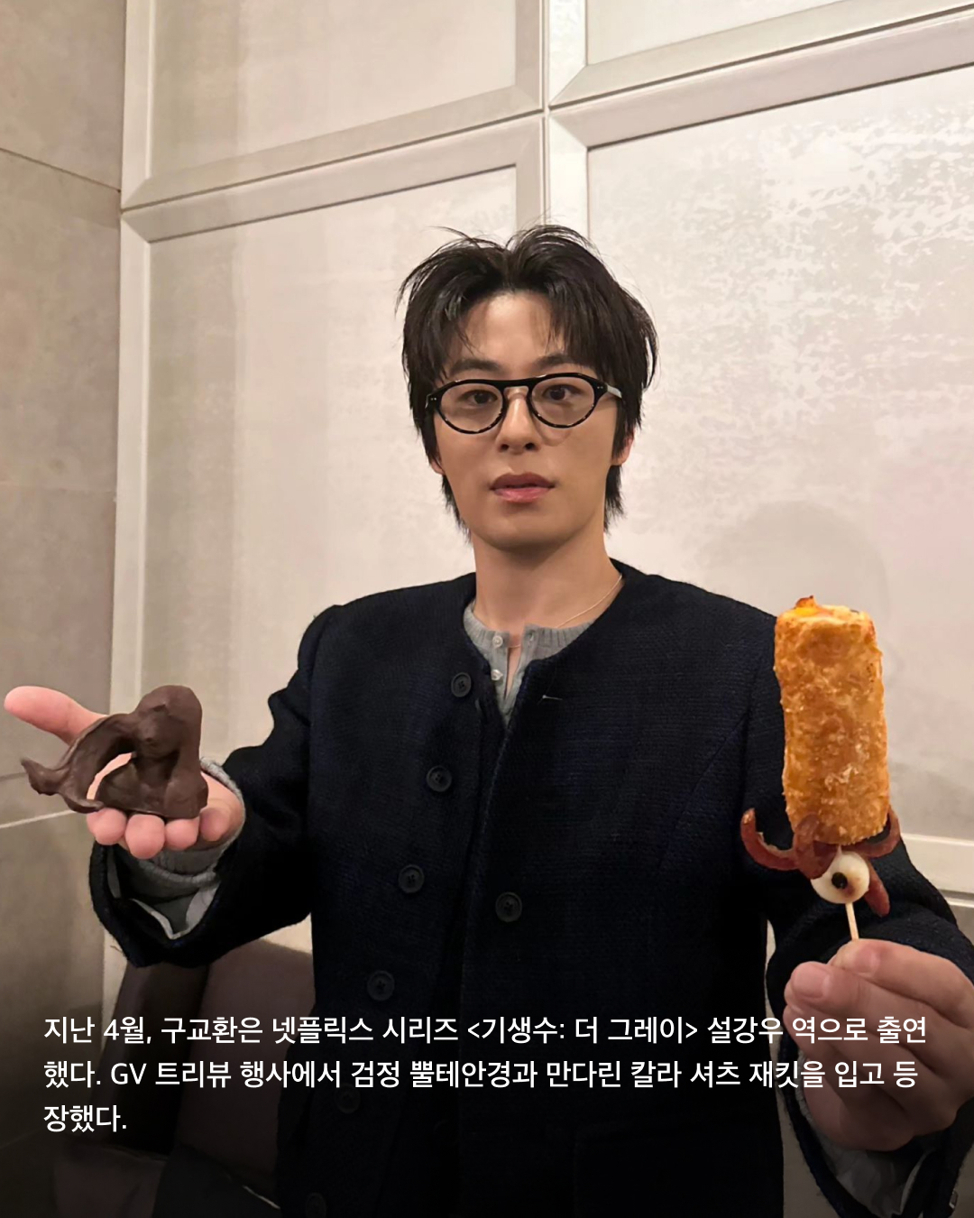 지난 4월, 구교환은 넷플릭스 시리즈 <기생수: 더 그레이> 설강우 역으로 출연했다. GV 트리뷰 행사에서 검정 뿔테안경과 만다린 칼라 셔츠 재킷을 입고 등장했다.