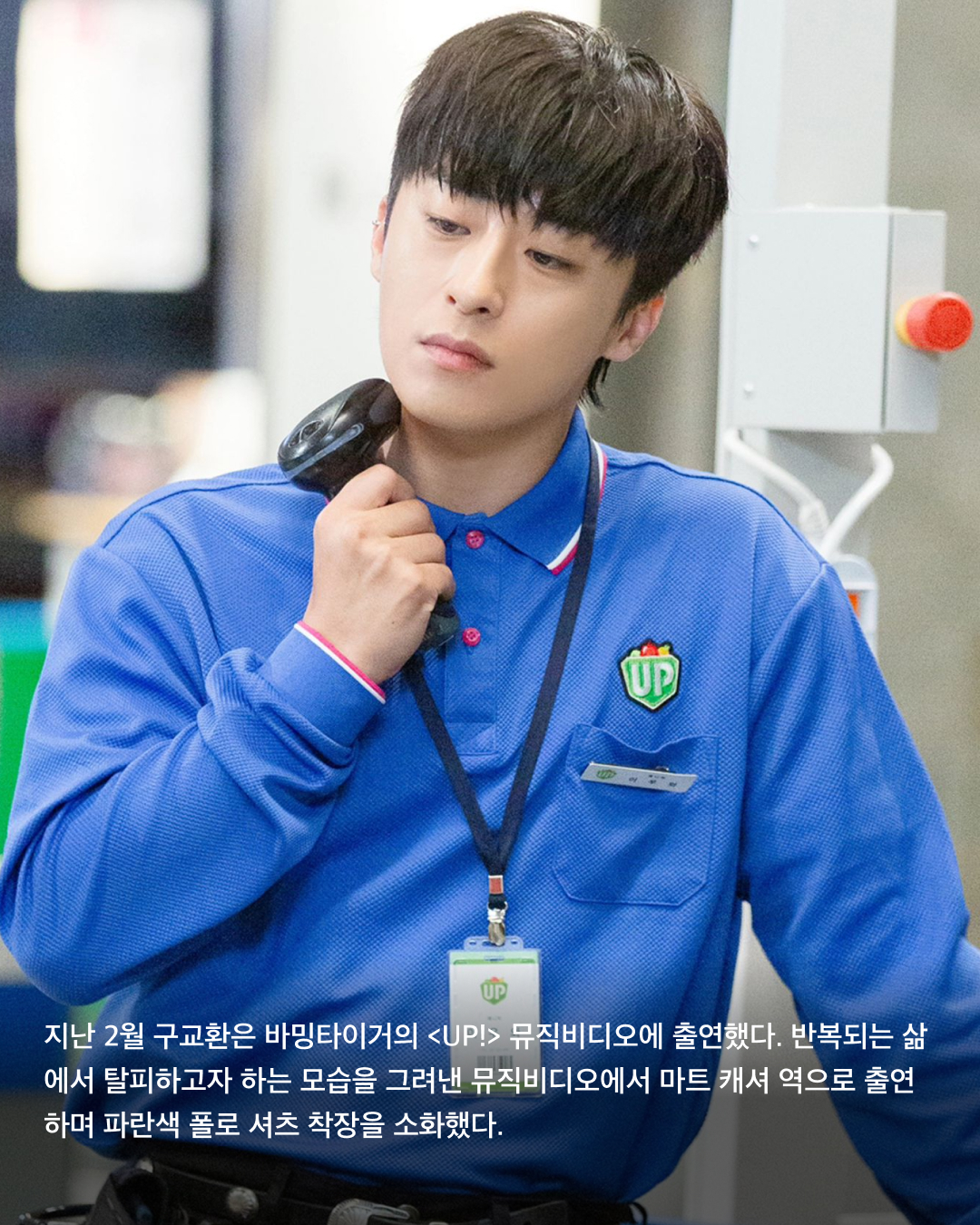 지난 2월 구교환은 바밍타이거의 <UP!> 뮤직비디오에 출연했다. 반복되는 삶에서 탈피하고자 하는 모습을 그려낸 뮤직비디오에서 마트 캐셔 역으로 출연하며 파란색 폴로 셔츠 착장을 소화했다.