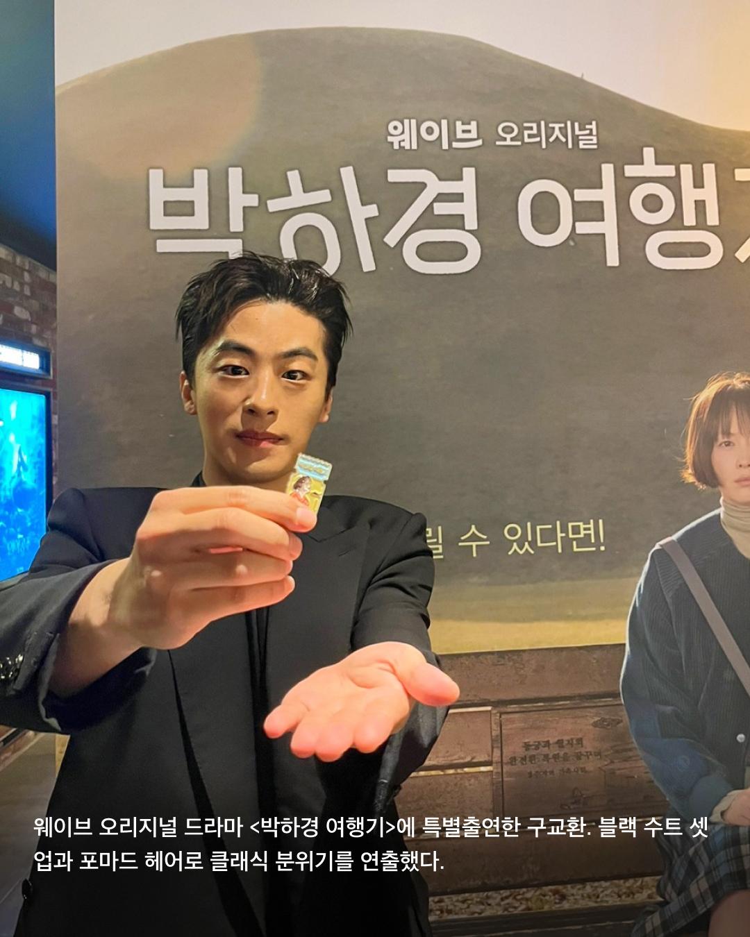 웨이브 오리지널 드라마 <박하경 여행기>에 특별출연한 구교환. 블랙 수트 셋업과 포마드 헤어로 클래식 분위기를 연출했다.
