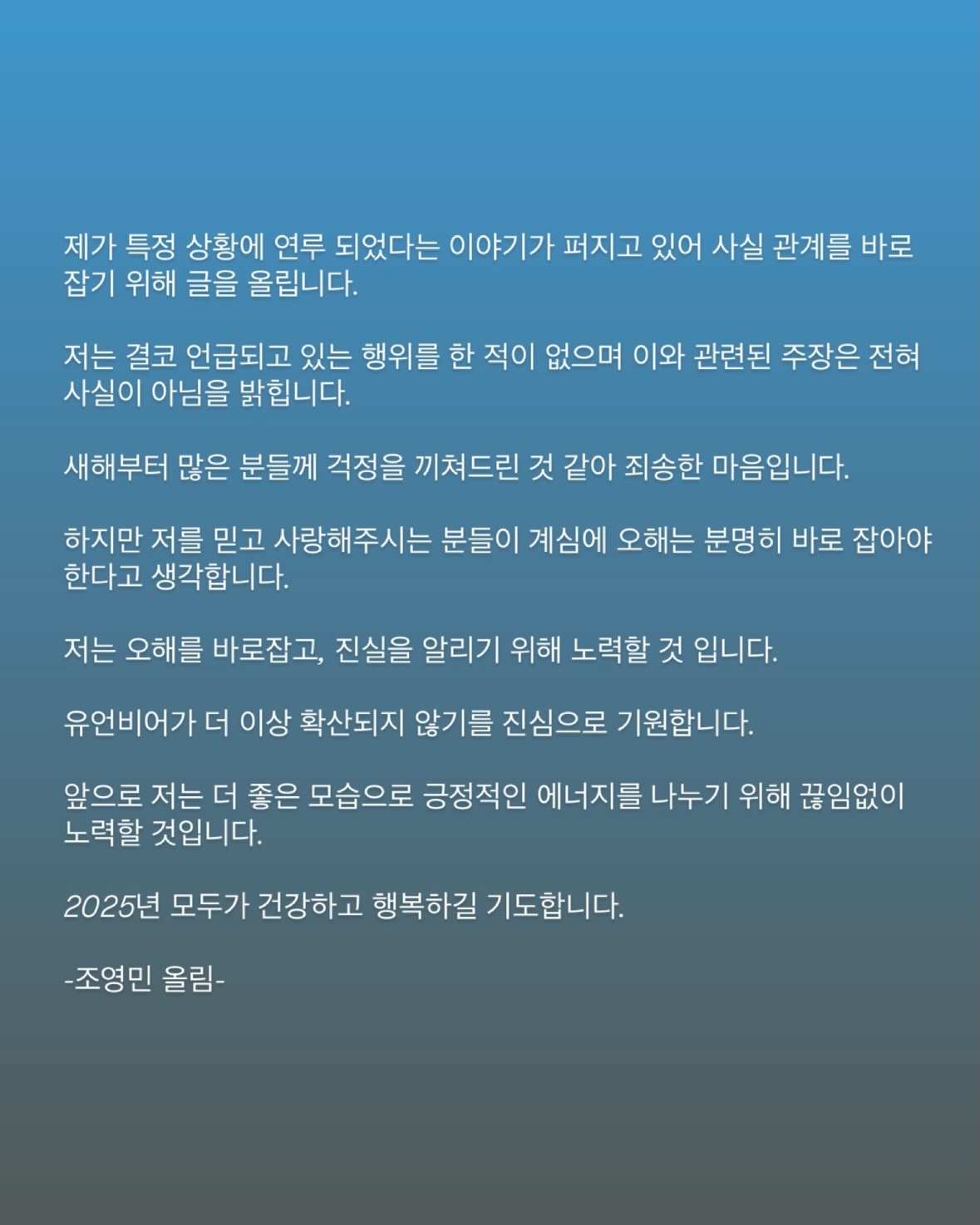 그러나 얼마 전 올라온 조영민의 스토리에는 자신은 결코 그런 행위를 하지 않았다며 입장을 밝혔는데,