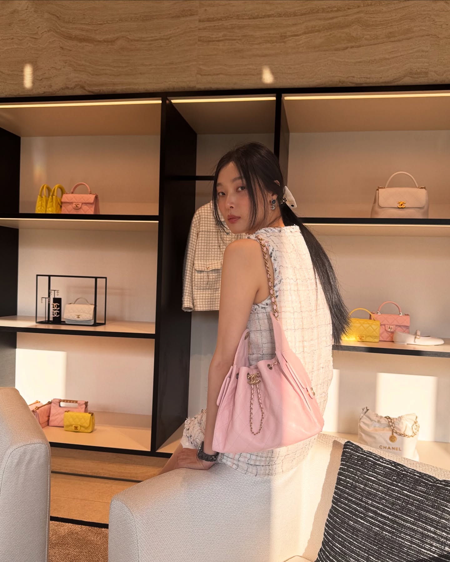 채령이 사복에서 찾은 샤넬 22🔍 다가오는 가을 숄더백 고민중?! 실용적인 단 하나의 샤넬🤍 채령의 사복 속 22백은 꾸안꾸룩에 높은 활용도를 보여줍니다. 샤넬 22백은 2022년 출시된 이후 꾸준한 인기를 유지 중인 스테디셀러입니다. 클래식 라인보다 좀 더 힘을 뺀 디자인이 특징이며 부드러운 가죽, 가벼운 무게, 체인 스트랩 덕분에 어떤 데일리 룩에도 쉽게 녹아듭니다. 채령 역시 샤넬 22백의 실용성을 증명하듯 같은 가방을 네 번 이상 스타일링했습니다. 반팔 코디에 편하게 툭 한번, 레더 자켓과 롱부츠로 시크하게 한번, 스웻팬츠와 가디건으로 꾸안꾸 무드를 살린 룩까지 모두 동일한 화이트 22백으로 완성했습니다. 공식 홈페이지 기준 채령이 든 화이트 컬러는 현재 미니백만 남아 있으며, 2025/26 가을-겨울 프리-컬렉션은 블랙, 다크브라운, 다크그레이 컬러로 사이즈는 미니, 스몰, 라지 3가지로 구성되어있습니다.샤넬 미니백