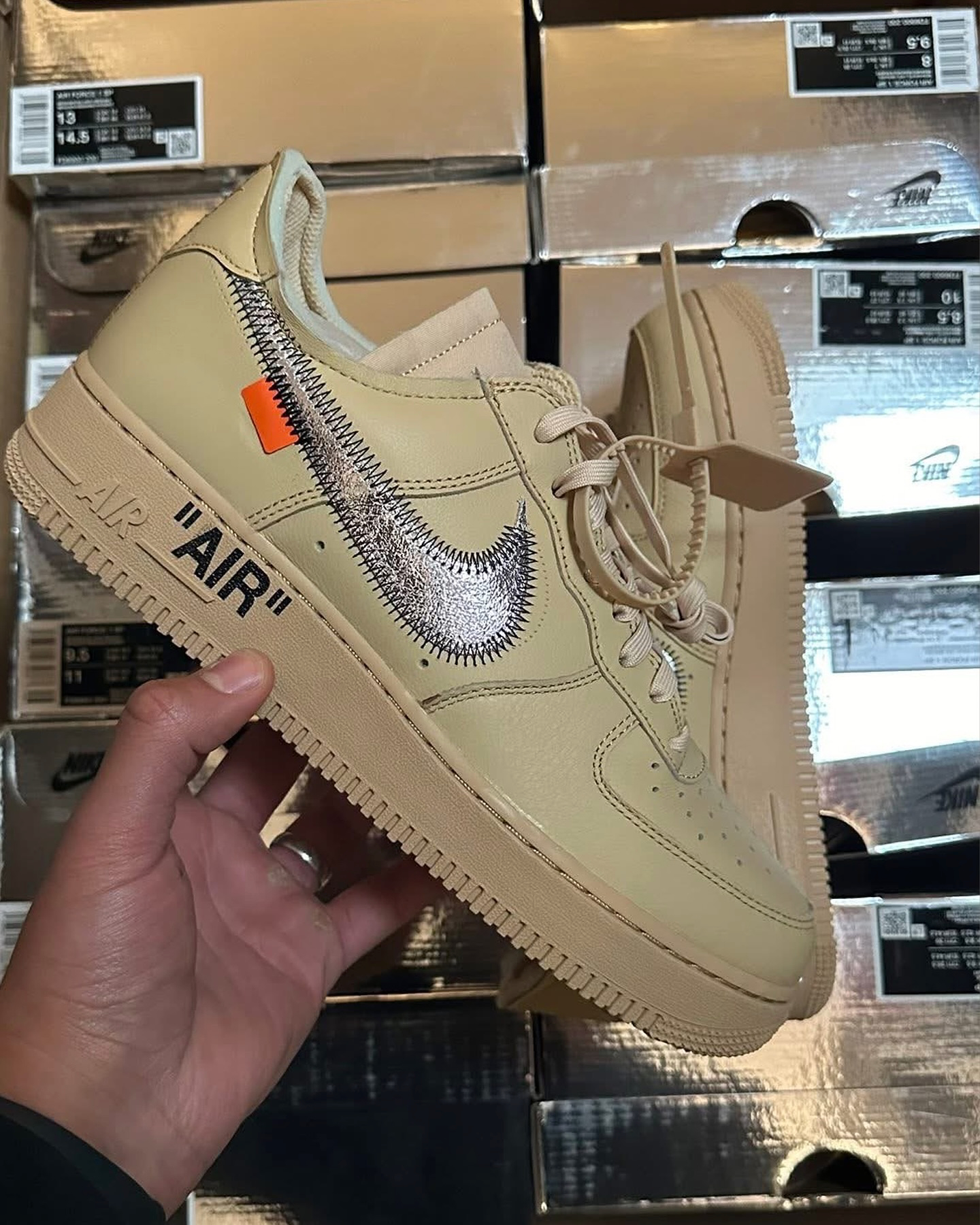 미공개 샘플 전시에서 처음 보인 이 모델은 부드러운 세서미 컬러 어퍼에 메탈릭 실버 스우시, 그리고 오프화이트 특유의 컷오프 텅과 스티치 디테일이 그대로 적용되었습니다.