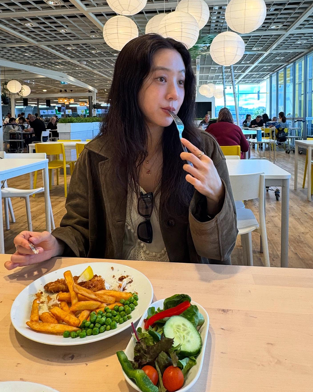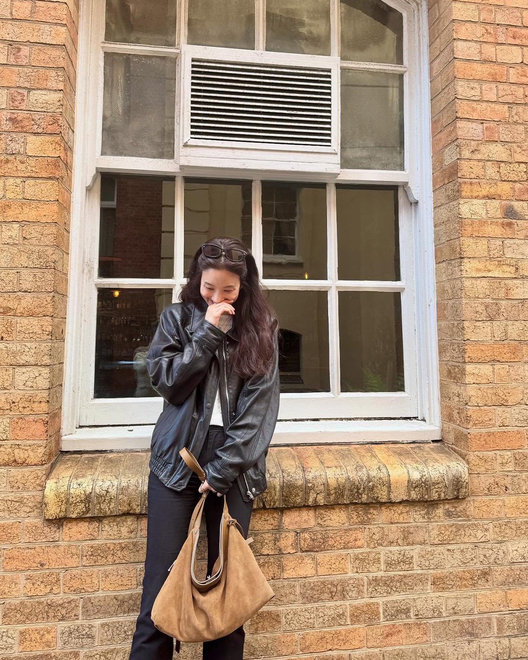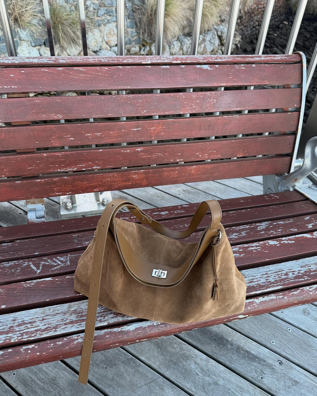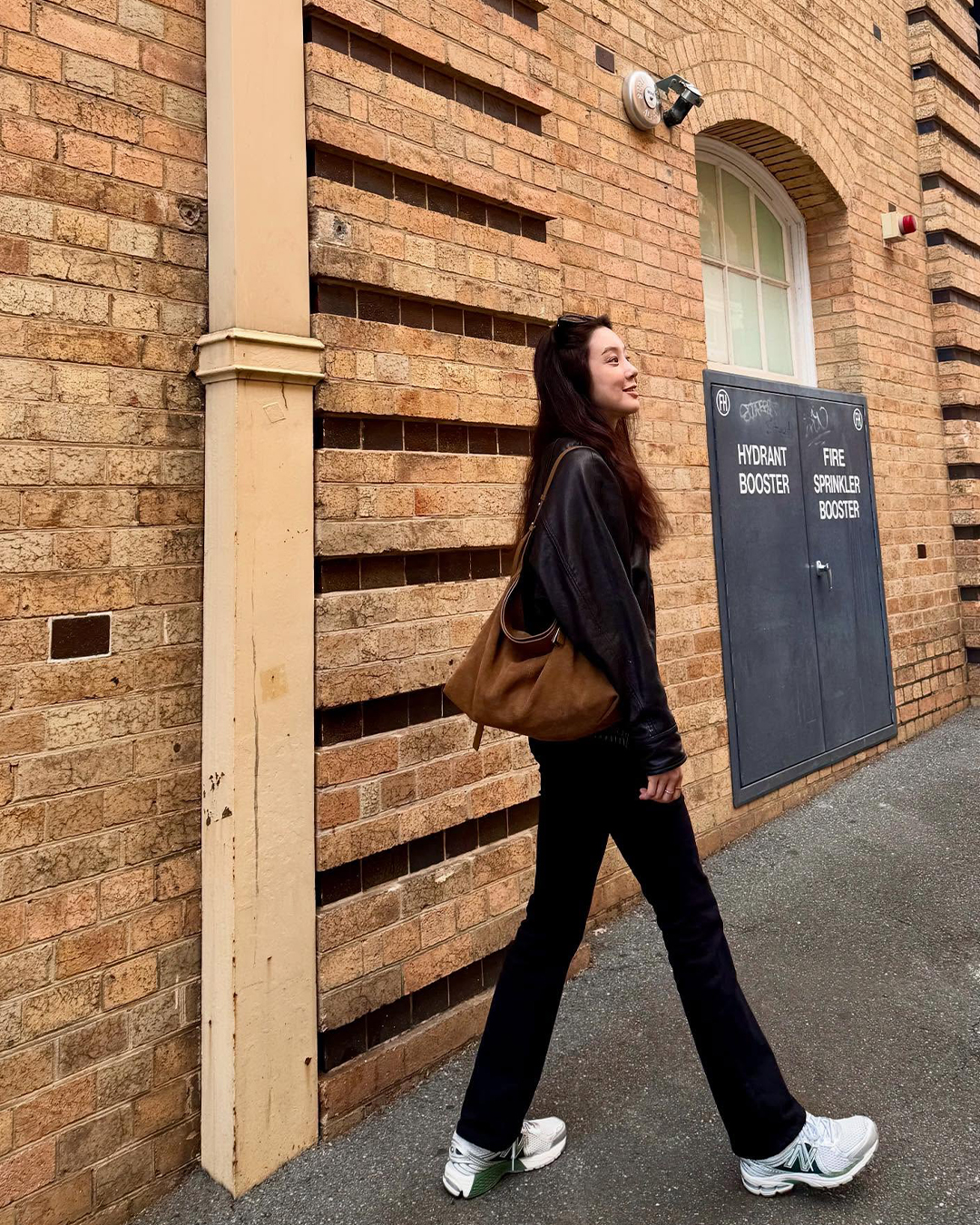 정려원은 올 가을 트렌드인 스웨이드 소재의 조이그라이슨 스웨이드 숄더백을 더했습니다. 따뜻한 골드 카키 컬러가 블랙 레더 재킷과 슬림 팬츠 사이에서 포인트가 되어, 가을 빈티지 무드에 좋습니다.