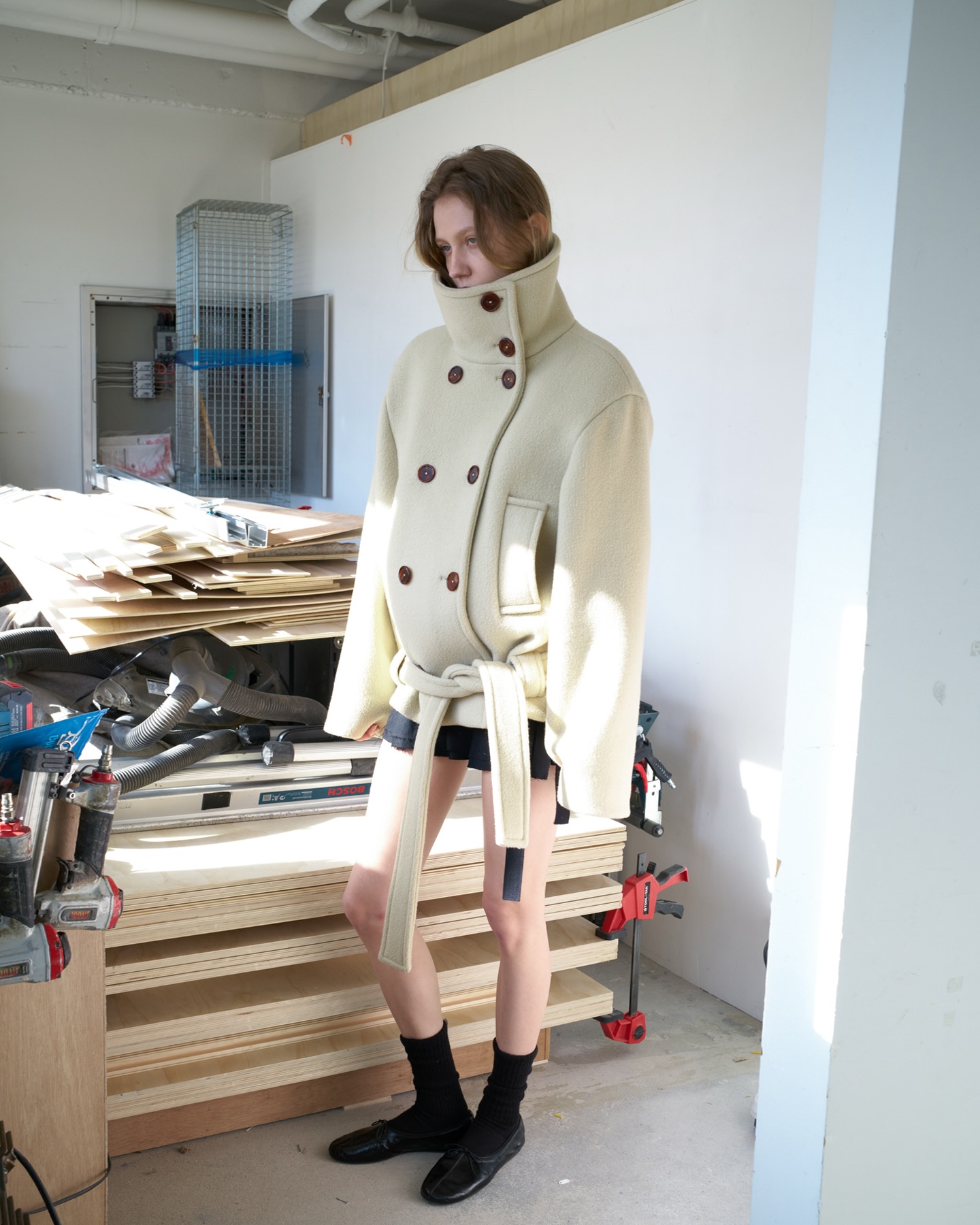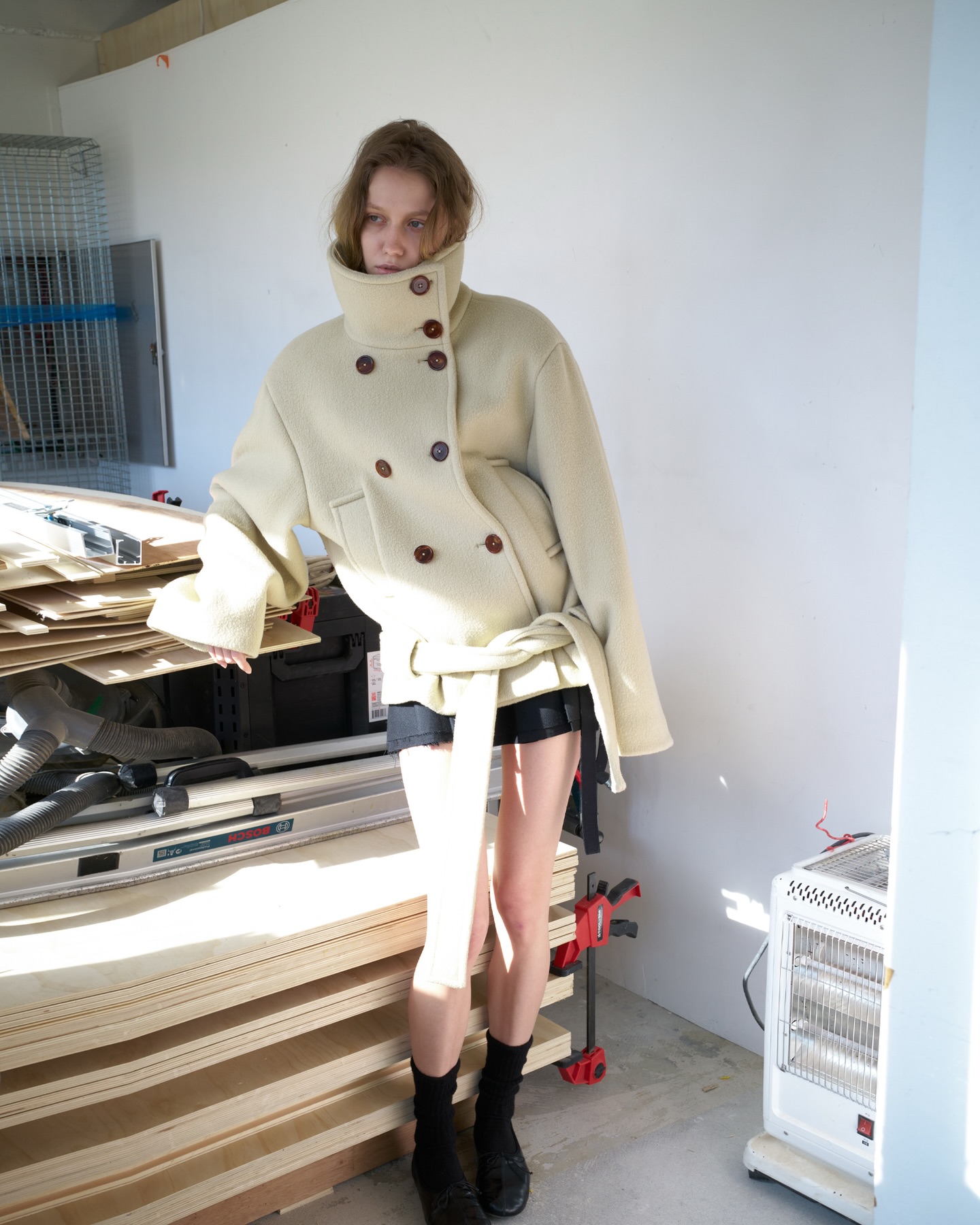 더블 브레스티드 구조와 단정한 버튼 배열은 클래식한 무드를 더하며, 과하지 않은 오버 핏이 다양한 이너와도 균형 있게 어우러집니다. 숏한 기장감 덕분에 하의 실루엣을 살리면서도 전체 스타일을 단단하게 잡아주는 점이 이 코트의 가장 큰 매력입니다.