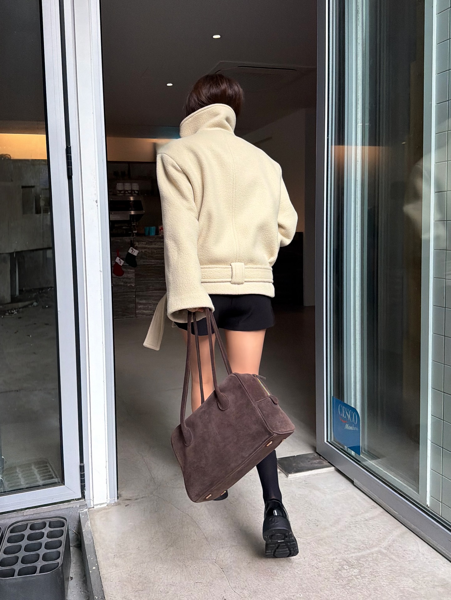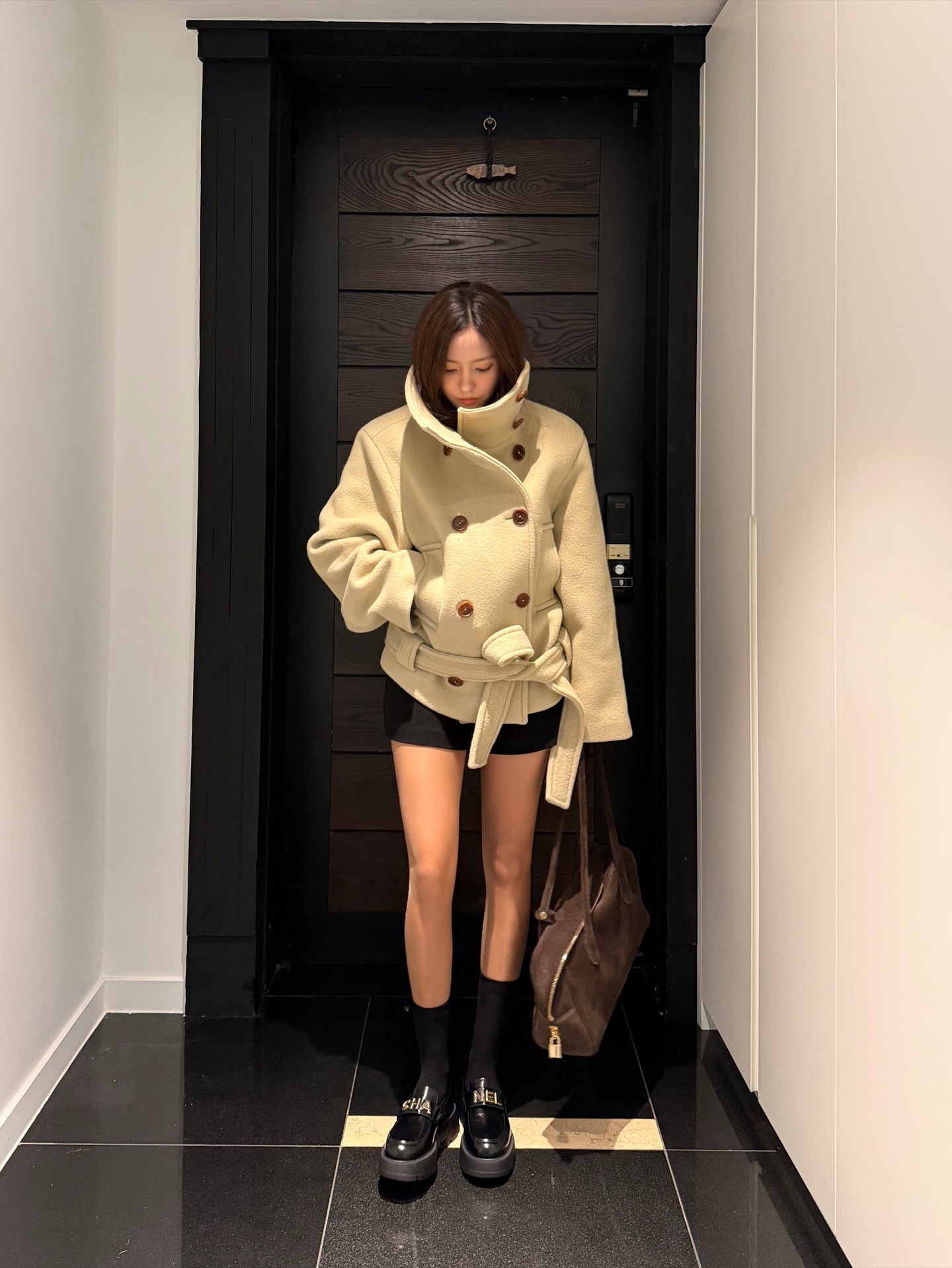 강추위에도 스타일을 잃지 않는 법? 효민의 하프 기장 코트를 살펴보세요. 블랙 숏팬츠에 샤넬 로퍼를 매치한 대담한 룩으로 시선을 사로 잡았습니다. 포인트가 된 에스이오 하이넥 더블 브레스티드 하프 코트는 짧은 기장임에도 겨울 아우터로서의 역할을 분명히 합니다.
