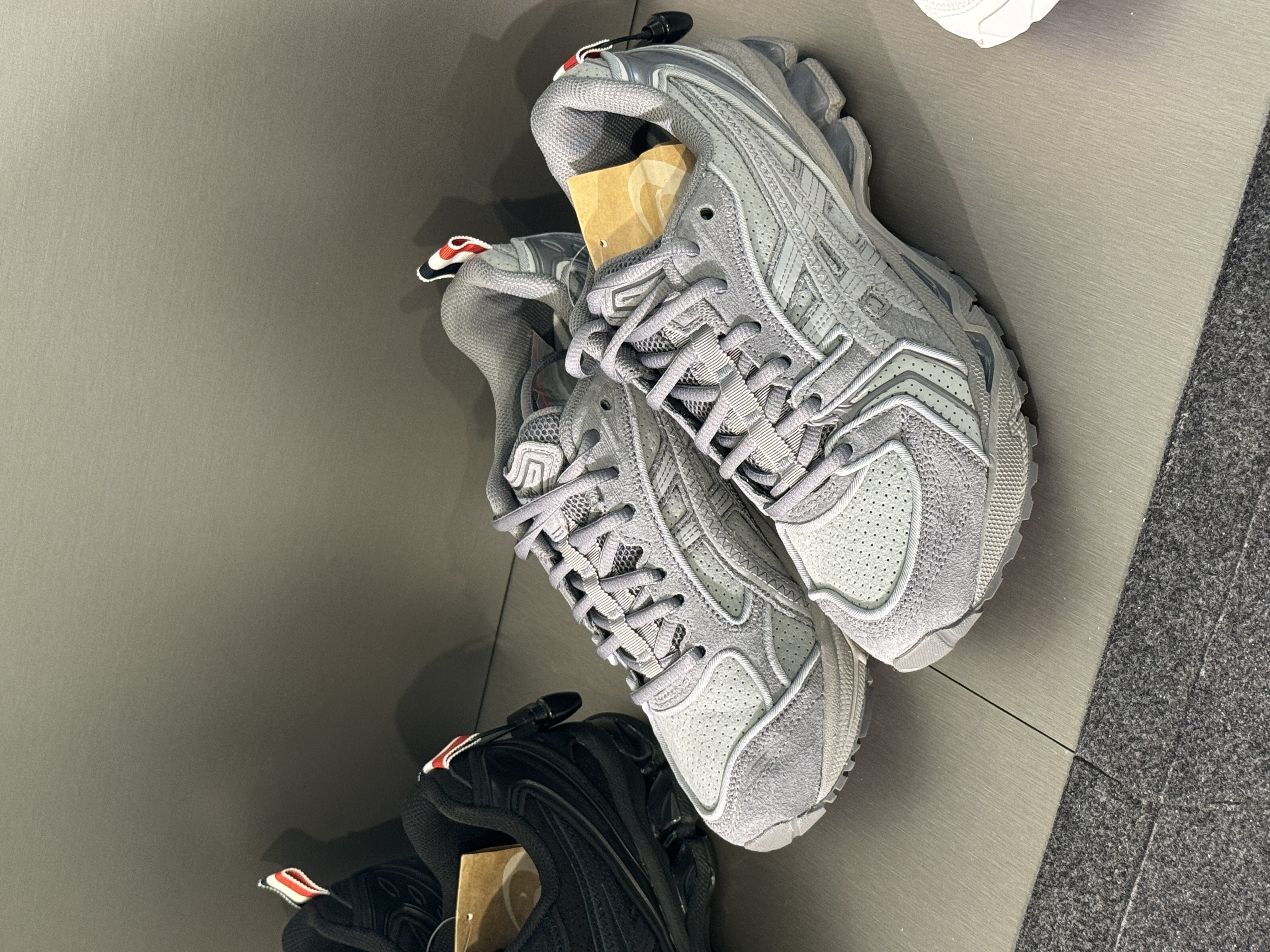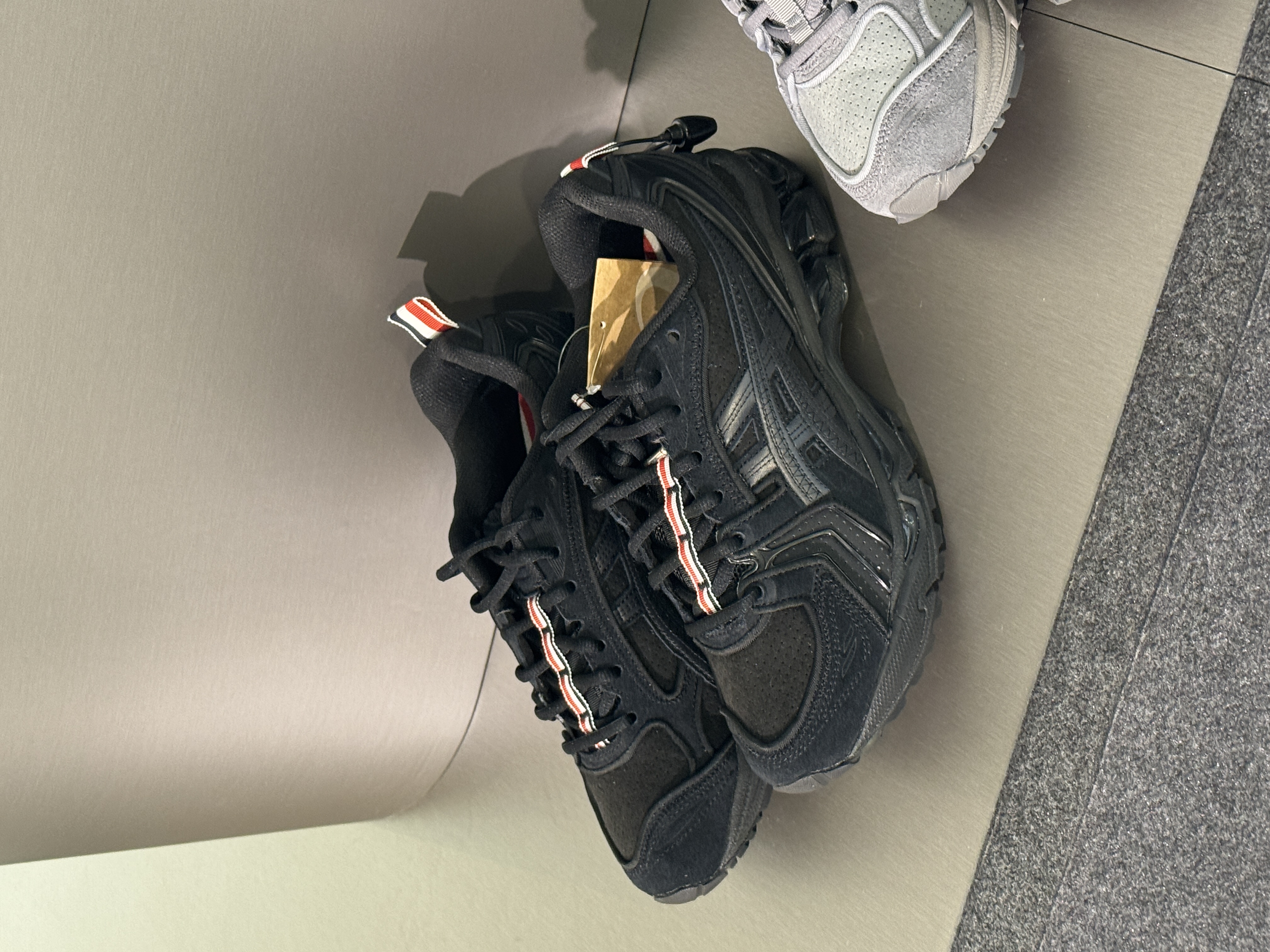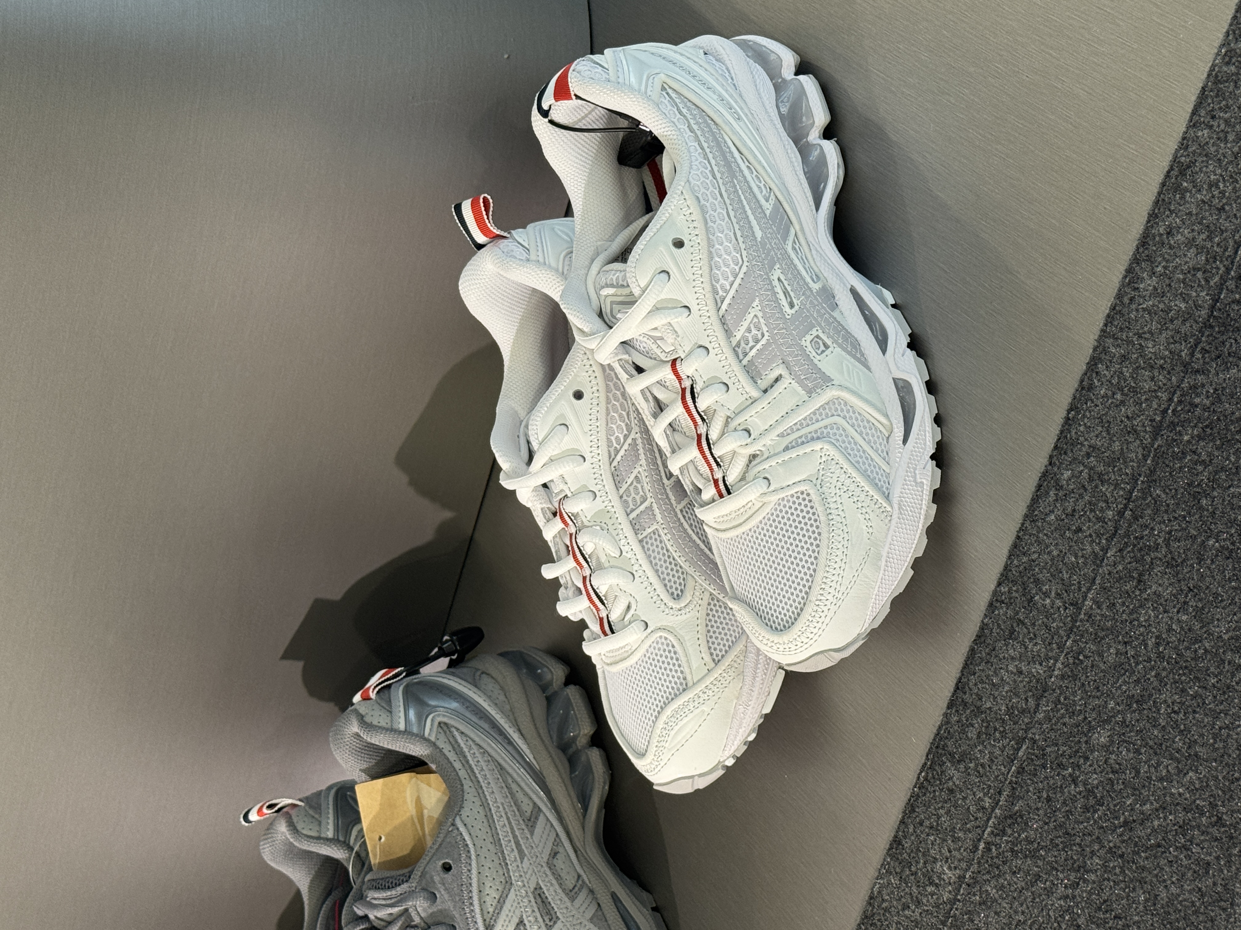 톰브라운, 아식스 콜라보 슈즈 공개👟🩶 톰브라운이 2026 가을 컬렉션 런웨이 쇼에서 아식스와의 첫 스니커즈 협업을 공개했습니다. 톰브라운이 재해석한 젤카야노 14(GEL-KAYANO 14)는 톰브라운 특유의 테일러드한 시선과 아식스의 테크 감성이 깔끔하게 어우러졌습니다. 런웨이에서 확인한 컬러웨이는 블랙, 그레이, 화이트 세 가지로 보이는데요. 역시 힐컵에는 톰브라운 고유의 삼선 로고도 빠지지 않았습니다. 3월 2일 발매되는 이번 스니커즈는 크롭 블레이저와 미니멀한 트랙 피스가 공존하는 톰브라운의 세계관과도 잘 어울립니다.톰브라운