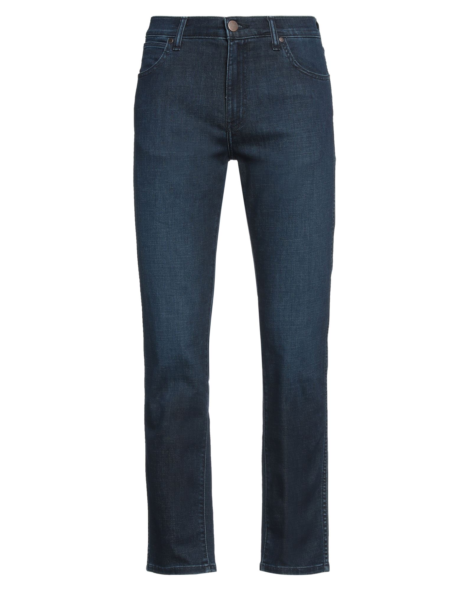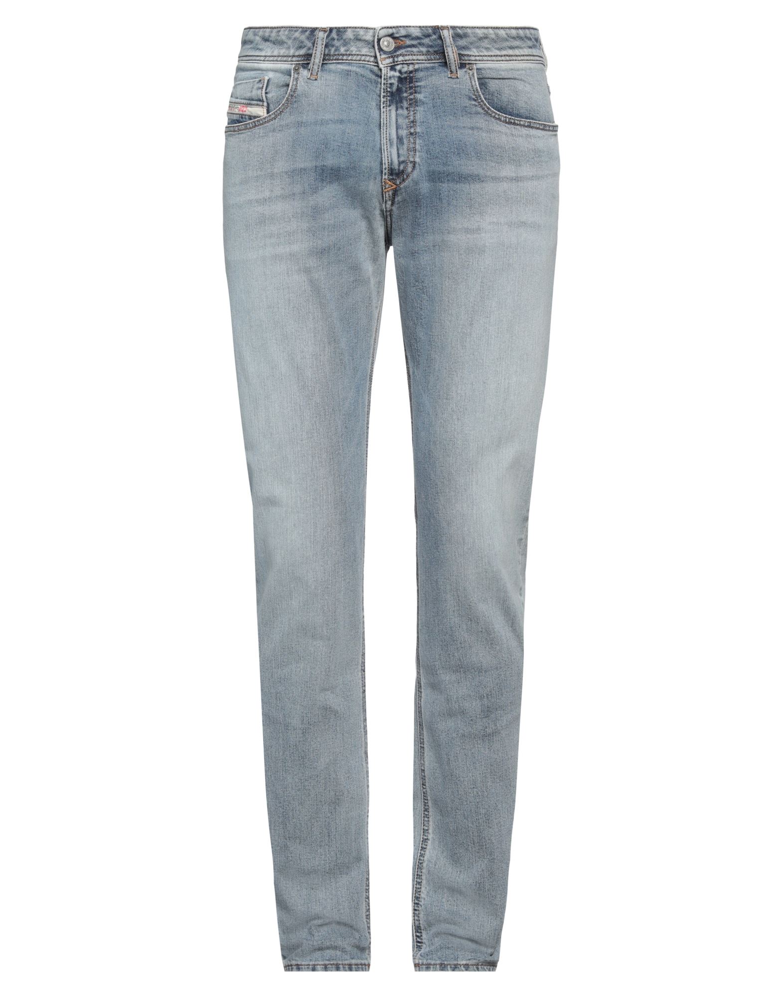 테이퍼드 진, 데님, 바랜 효과, 스트레치 패브릭, 솔리드 컬러, 브랜드 로고, 미디엄 워싱, 하이 웨이스트, 벨트 루프, 테이퍼드 레그, 레귤러 핏, 지퍼 여밈, 1 버튼, 포켓 5개.
