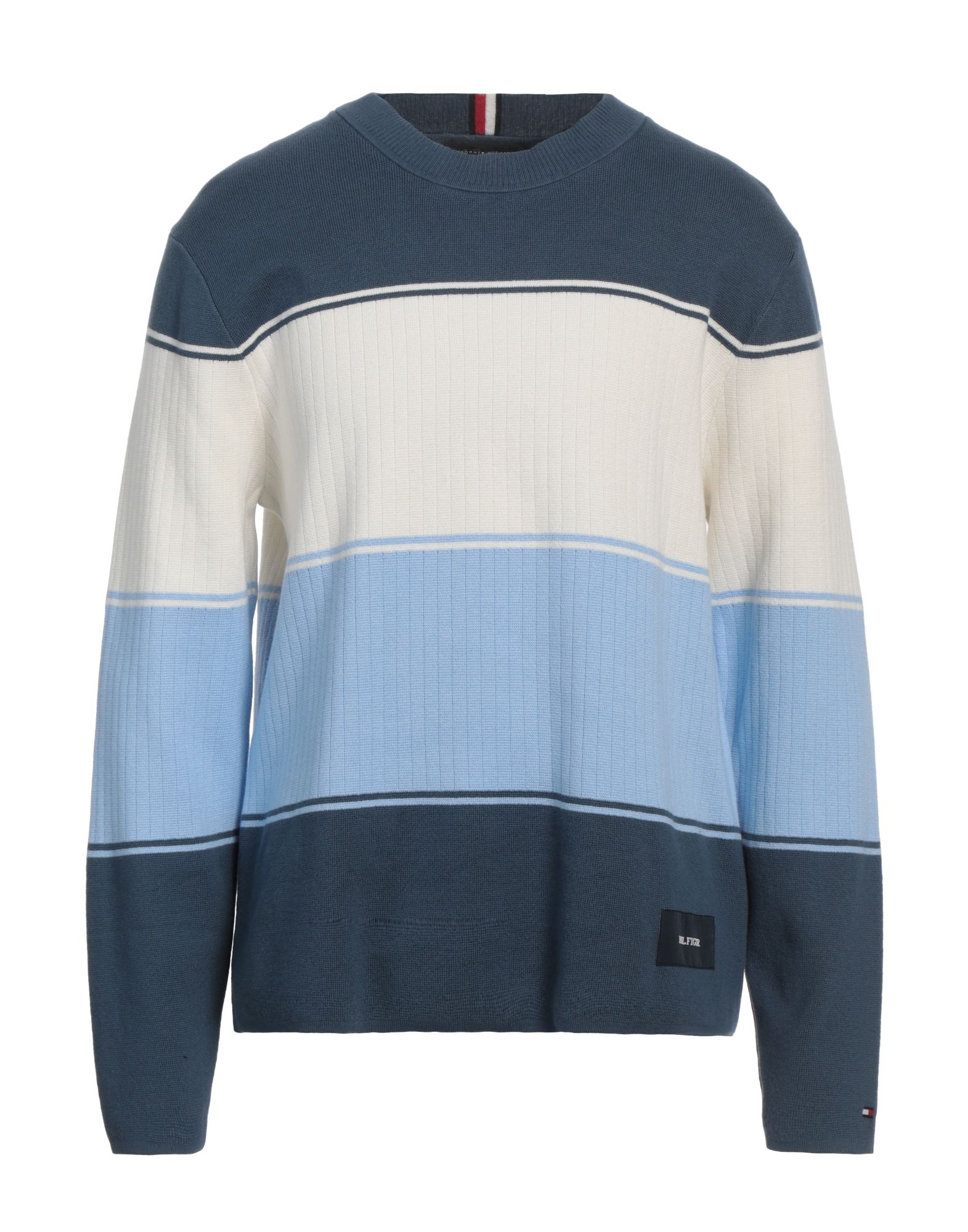 니트 소재, 라이트웨이트 니트, 브랜드 로고, 투톤 패턴, 크루넥, 롱 슬리브, 포켓 없음, 손세탁, 표백 금지, 건조기 사용불가.