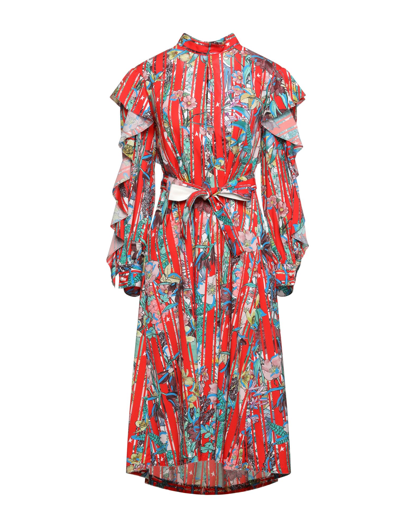 셔츠 드레스, 크레이프, 멀티컬러 패턴, 벨트, 브랜드 로고, v 네크라인, 쇼트 슬리브, 안감없음, 버튼 여밈, 멀티 포켓.