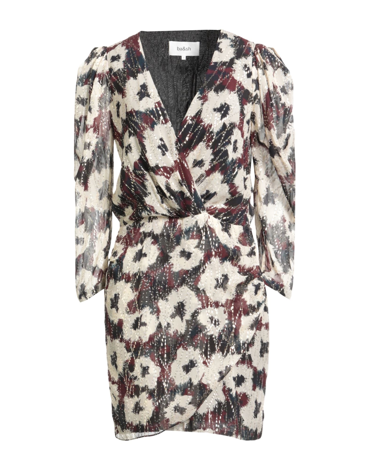 플레어 드레스, 크레이프, 플로럴 모티브, 장식 부착 없음, v 네크라인, 쇼트 슬리브, 부분적으로 안감 처리한 내부, 지퍼 여밈, 1 버튼, 포켓 없음.