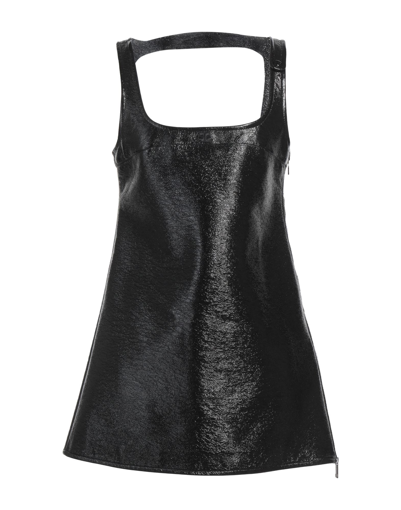 플레어 드레스, 인조가죽, 솔리드 컬러, 브랜드 로고, 와이드 네크라인, 슬리브리스, 안감있음, 지퍼 여밈, 스트레치, 드라이클리닝, 표백 금지, 건조기 사용불가.