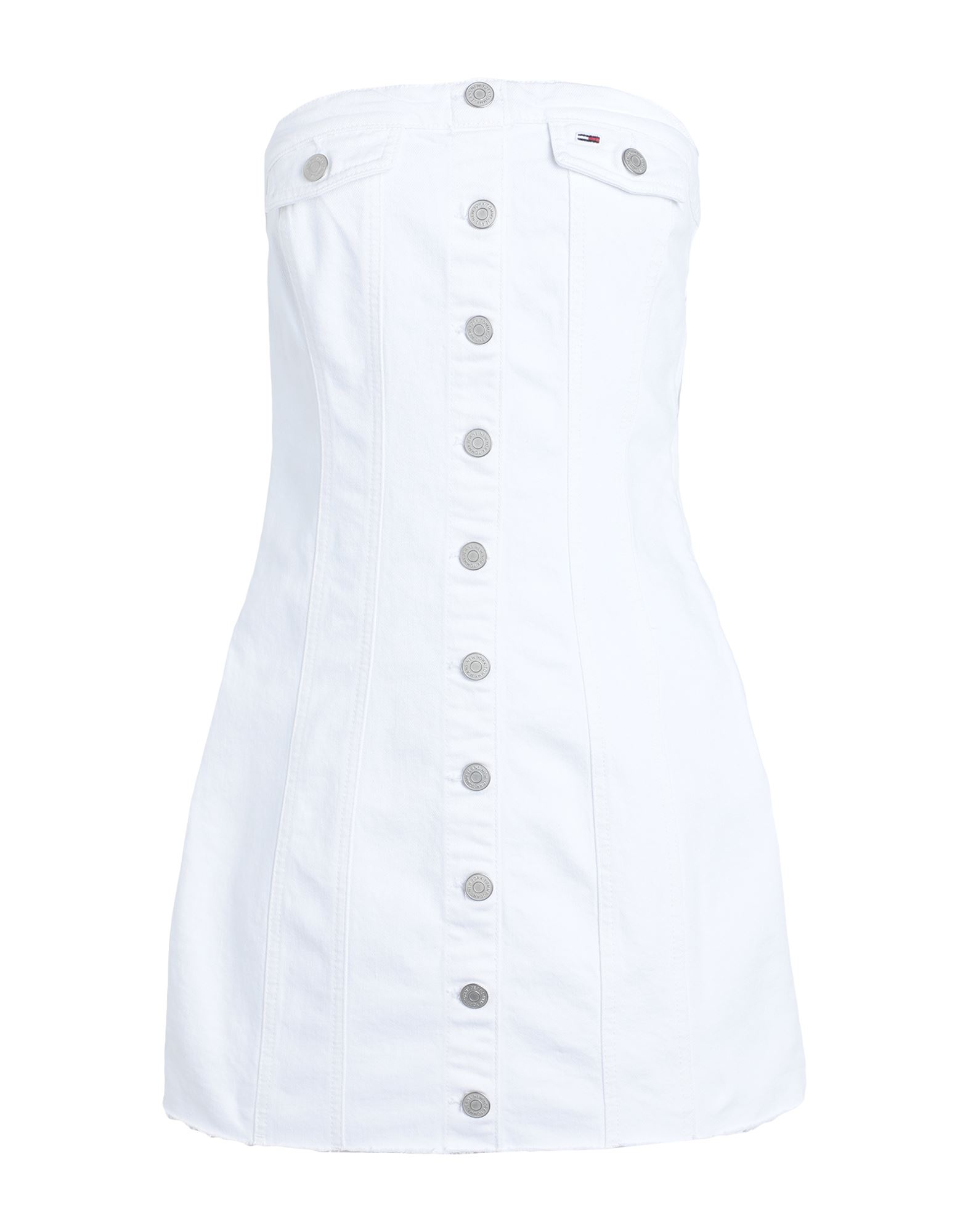 플레어 드레스, 데님, 자카드, 스트레치 패브릭, 투톤 패턴, 브랜드 로고, 와이드 네크라인, 다크 워싱, 쇼트 슬리브, 안감없음, 슬릿 포켓, 세탁기로 세탁, 표백 금지, 건조기 사용불가.