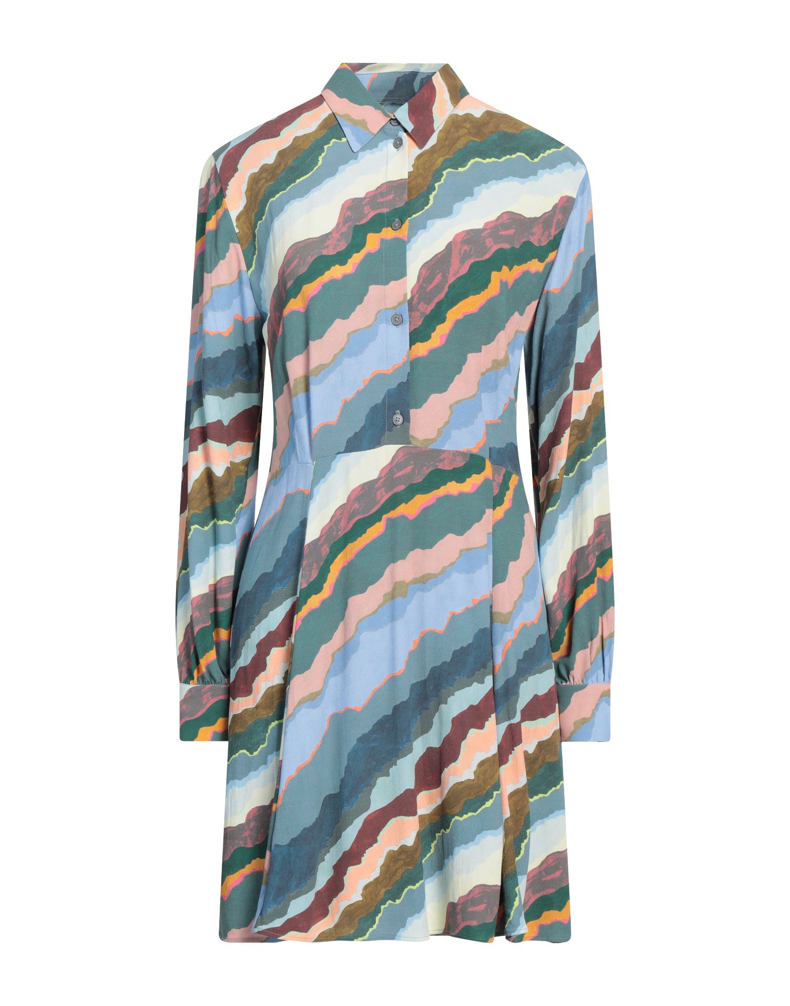 셔츠 드레스, 크레이프, 멀티컬러 패턴, 장식 부착 없음, 클래식 칼라, 롱 슬리브, 버튼 커프스, 안감없음, 지퍼 여밈, 버튼 여밈, 동물성 비섬유 자재 함유, 세탁기 세탁 또는 드라이클리닝, 표백 금지, 건조기 사용불가.