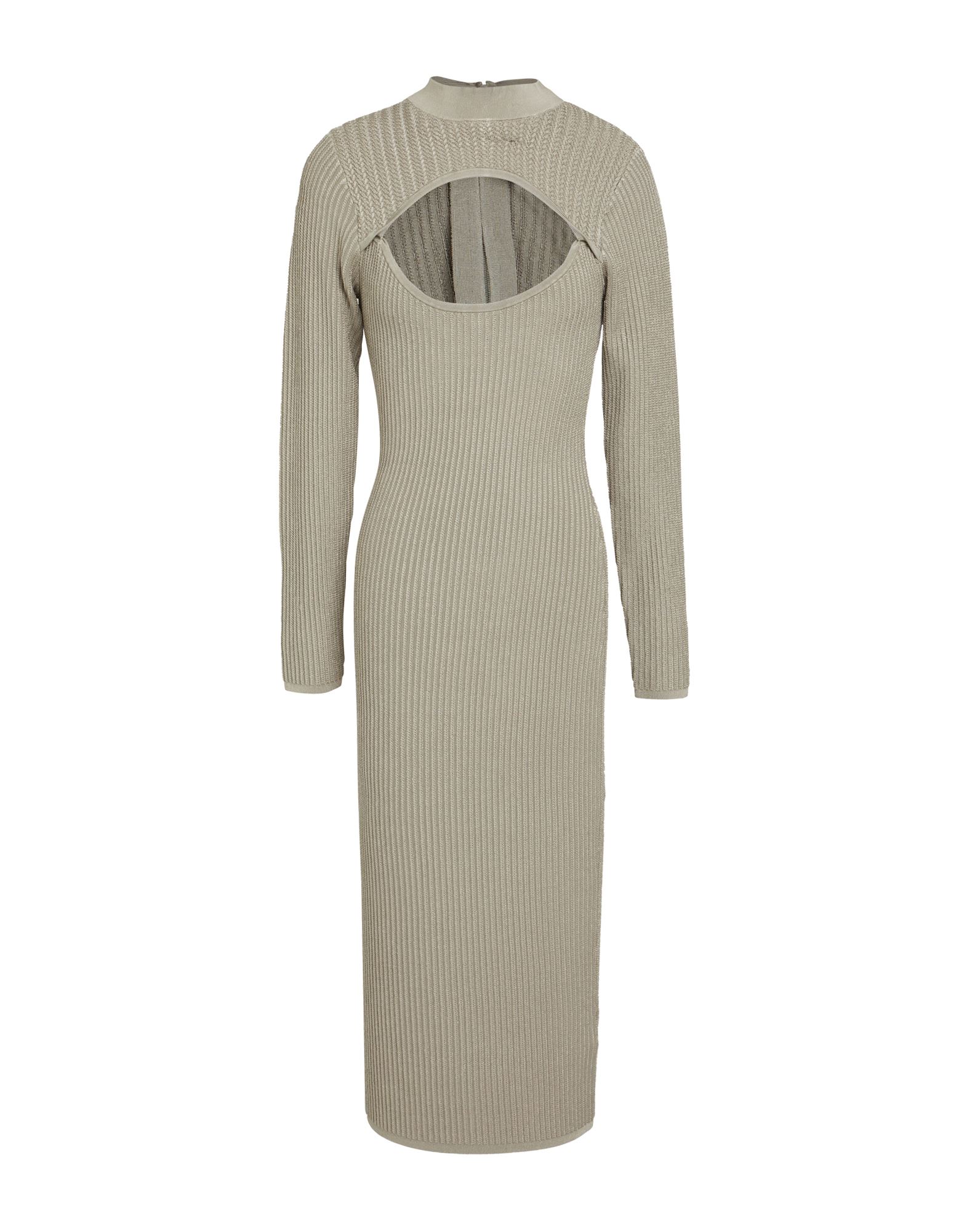 바디콘 드레스, 리브(rib) 조직, 라이트웨이트 니트, 솔리드 컬러, 자수 로고 장식, 오픈 백, 와이드 네크라인, 롱 슬리브, 안감없음, 후크 여밈, 세탁기로 세탁, 표백 금지, 건조기 사용불가.