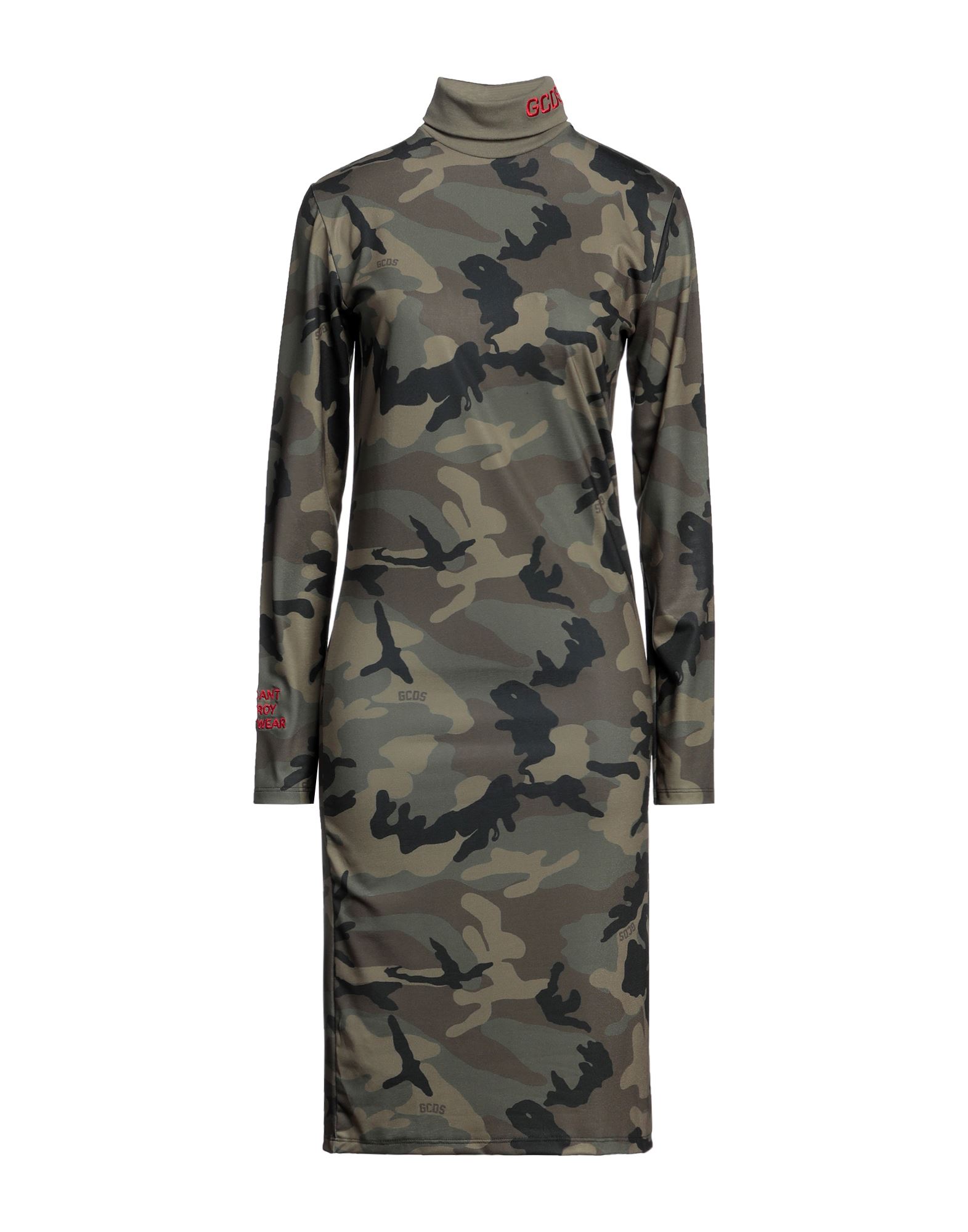 저지, 브랜드 로고, 카무플라주 패턴, 터틀넥, 롱 슬리브, 안감없음, 포켓 없음, 펜슬 스커트.