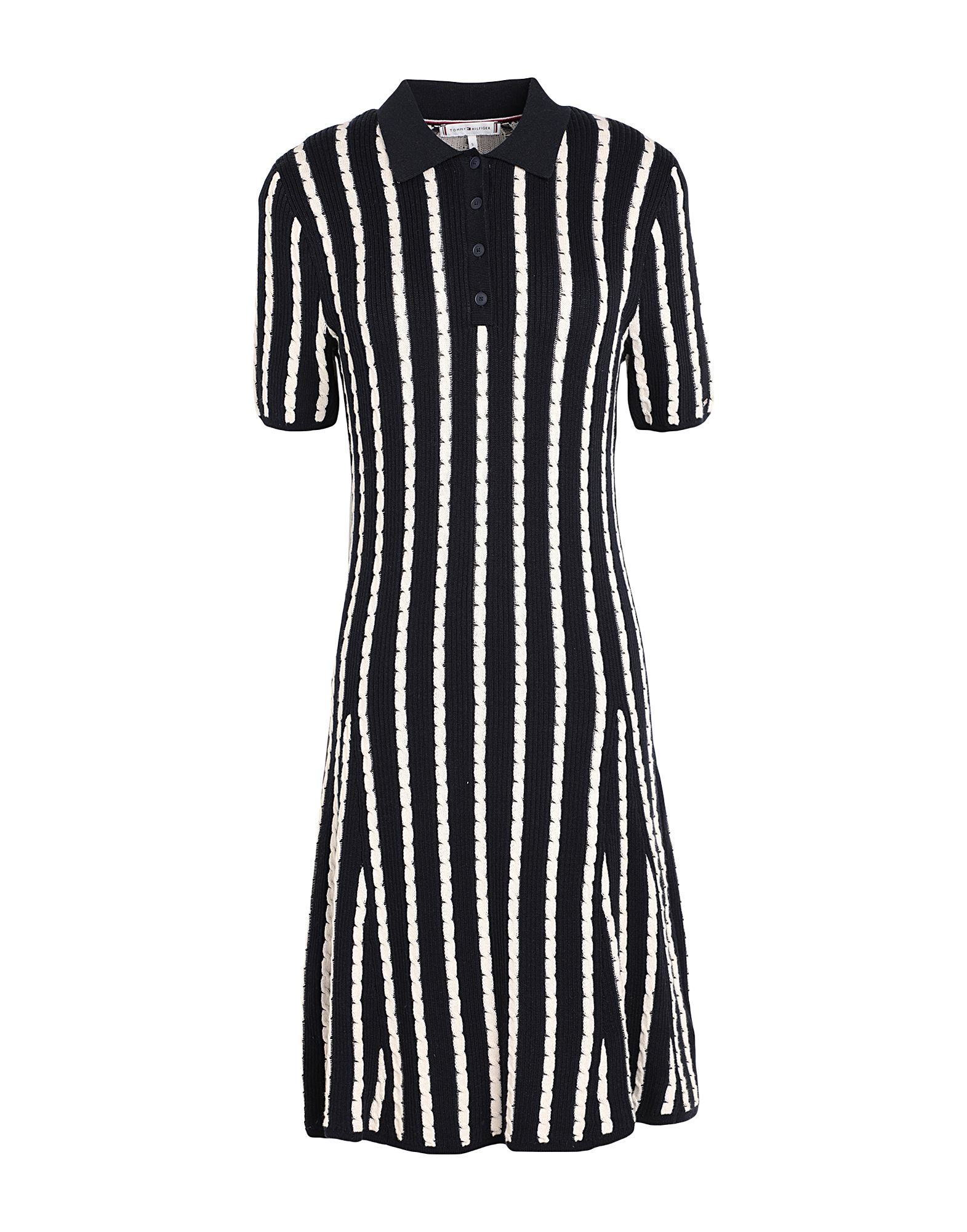 케이블 니트, 미디엄웨이트 니트, 브랜드 로고, 스트라이프, 폴로 칼라, 쇼트 슬리브, 안감없음, 버튼 여밈, 포켓 없음, 세탁기로 세탁, 건조기 사용불가, 티셔츠 원피스.