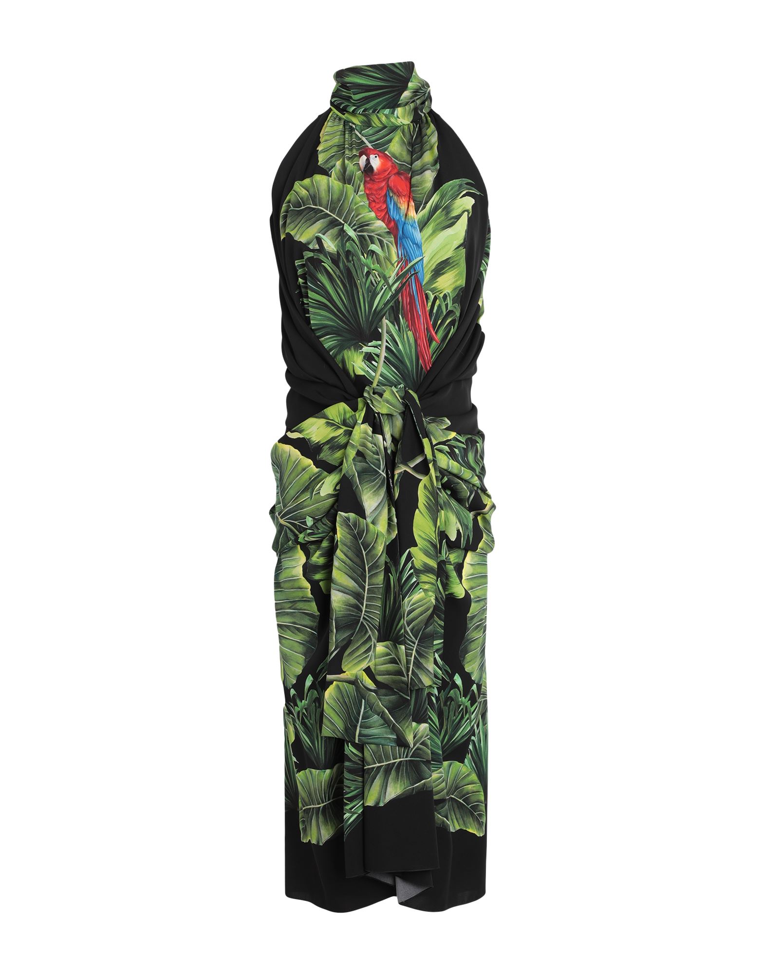 바디콘 드레스, 크레이프, 하와이안 모티브, 개더 디테일, 보우 타이 네크라인, 슬리브리스, 부분적으로 안감 처리한 내부, 지퍼 여밈, 포켓 없음, 스트레치, 드라이클리닝, 표백 금지, 건조기 사용불가.