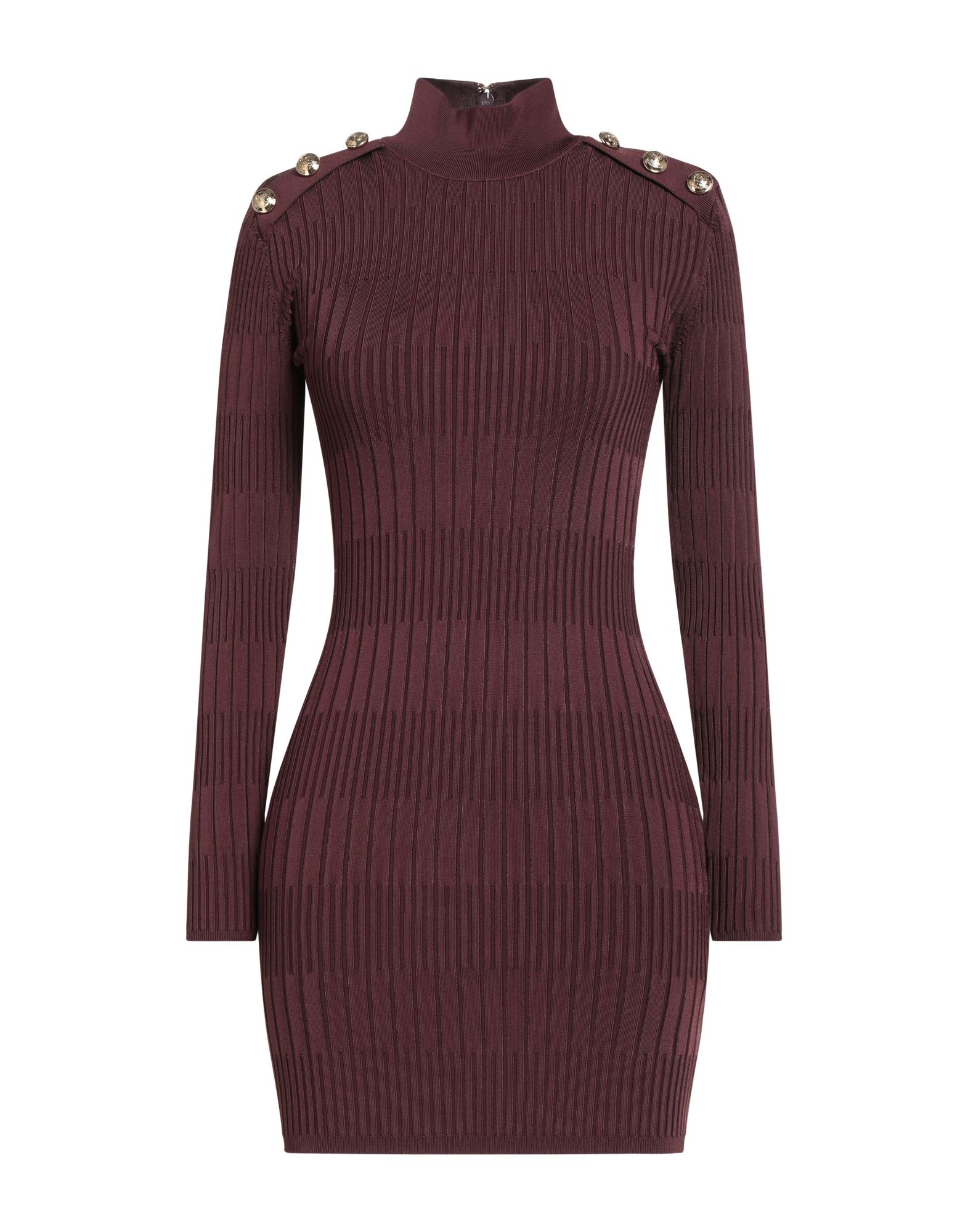 바디콘 드레스, 리브 조직 저지, 스트레치 패브릭, 장식 디테일 솔리드 컬러, 버튼 장식, 터틀넥, 롱 슬리브, 어깨 패드, 안감없음, 지퍼 여밈, 손세탁 또는 드라이클리닝, 표백 금지, 건조기 사용불가.