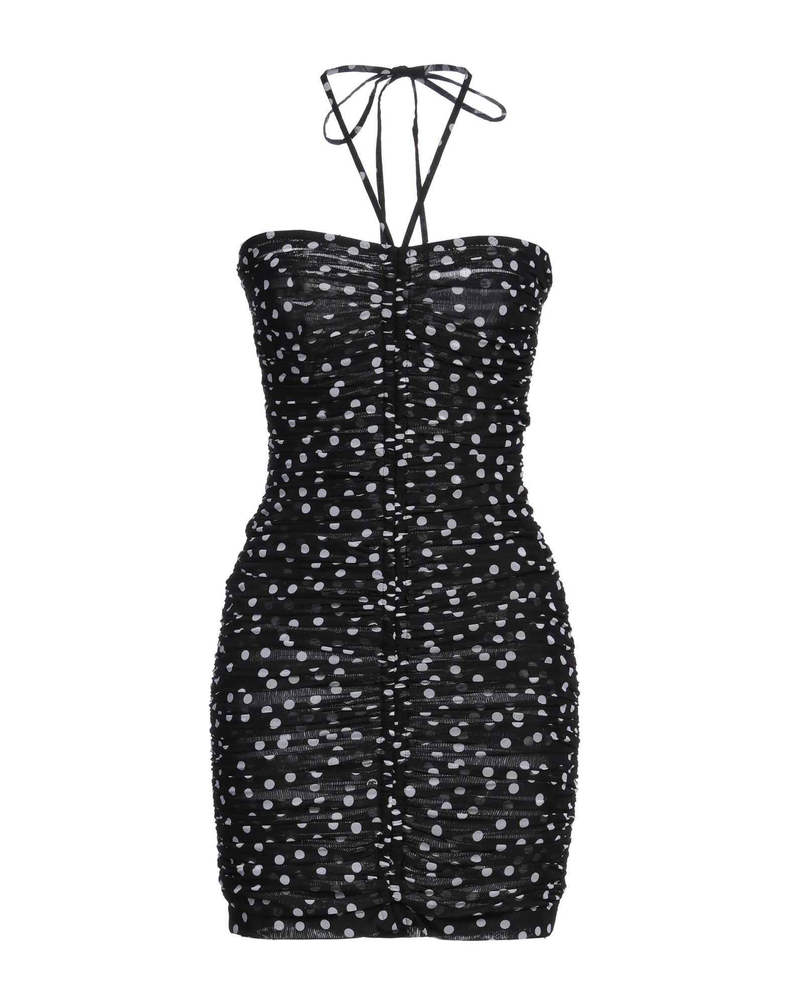 바디콘 드레스, 튤, 폴카도트, 브랜드 로고, 개더 디테일, 홀터넥, 슬리브리스, 안감있음, 후크 여밈, 지퍼 여밈, 스트레치, 드라이클리닝, 표백 금지, 건조기 사용불가.