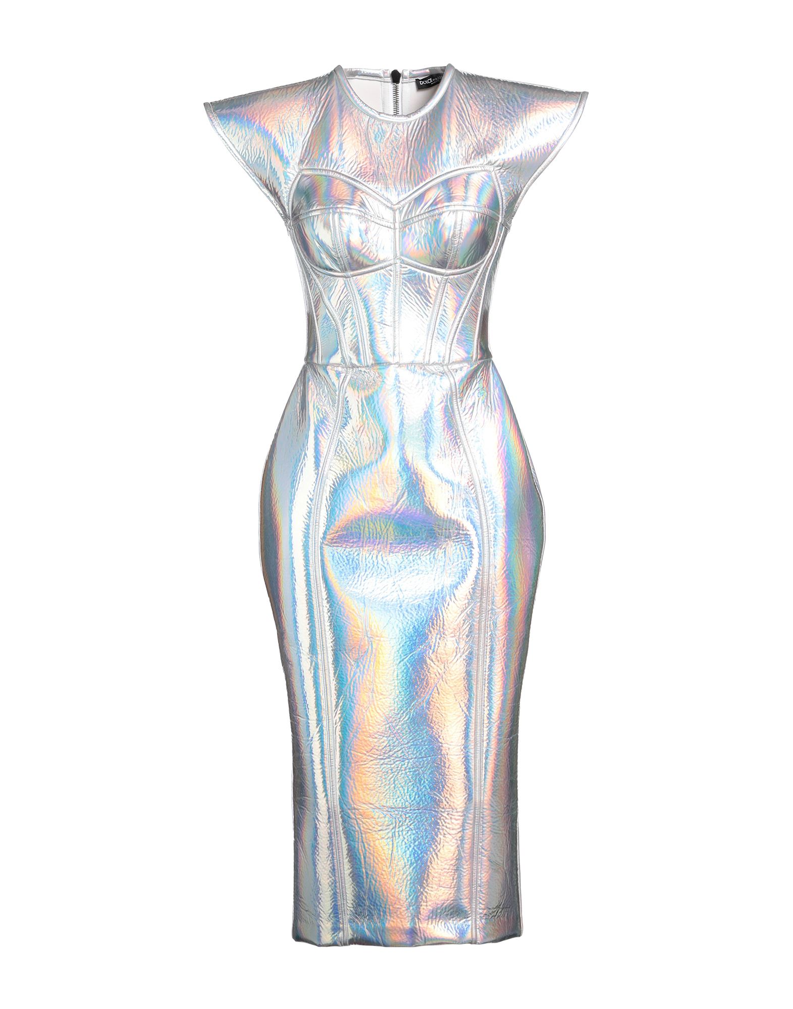 테크니컬 패브릭, 메탈릭 효과, 장식 부착 없음, 솔리드 컬러, 크루넥, 쇼트 슬리브, 안감있음, 지퍼 여밈, 포켓 없음, 바디콘 드레스.