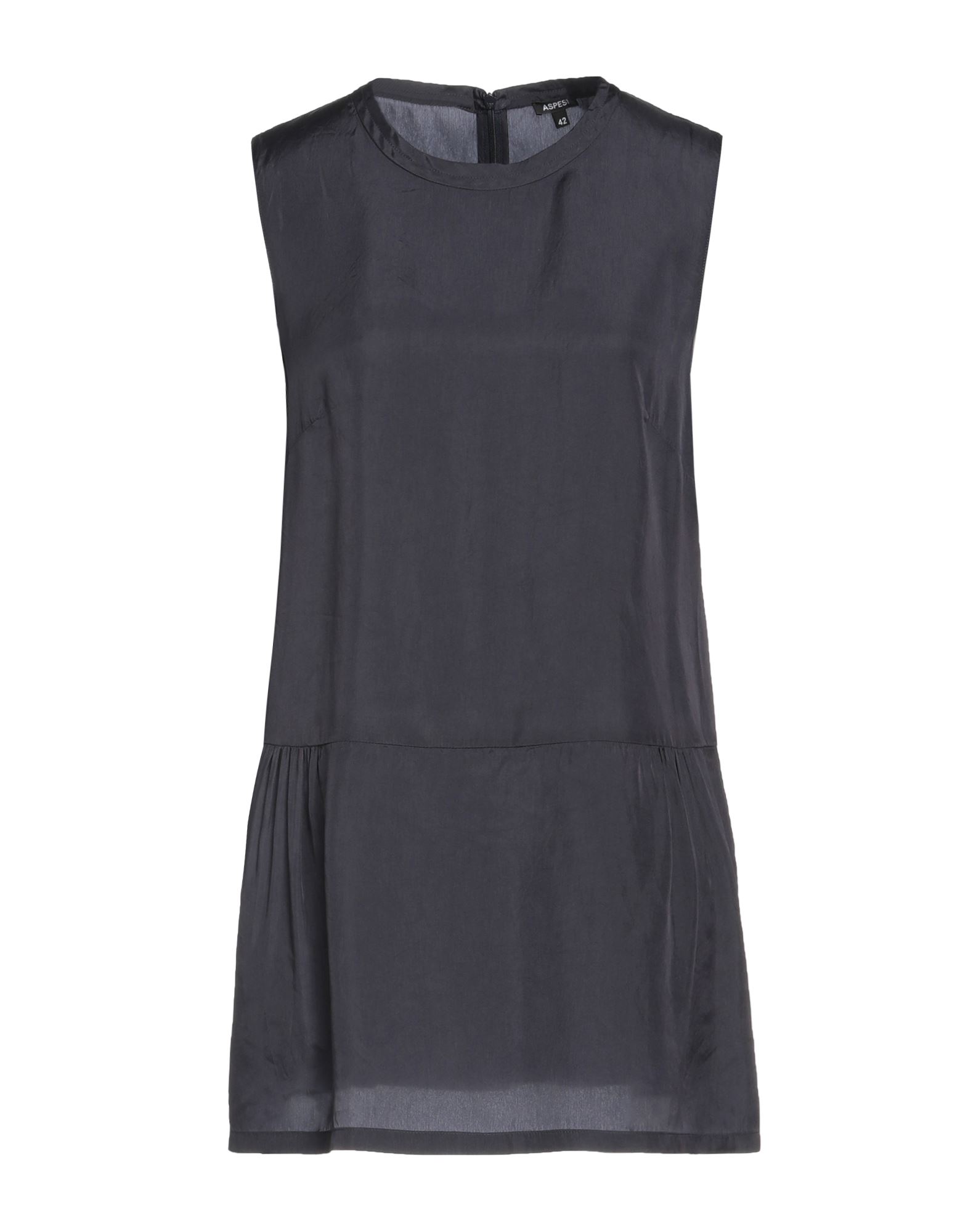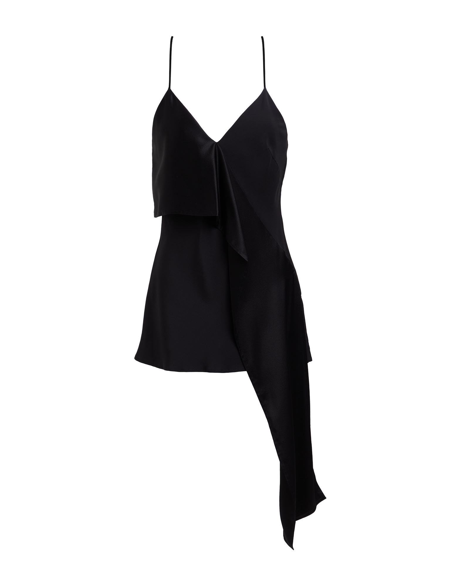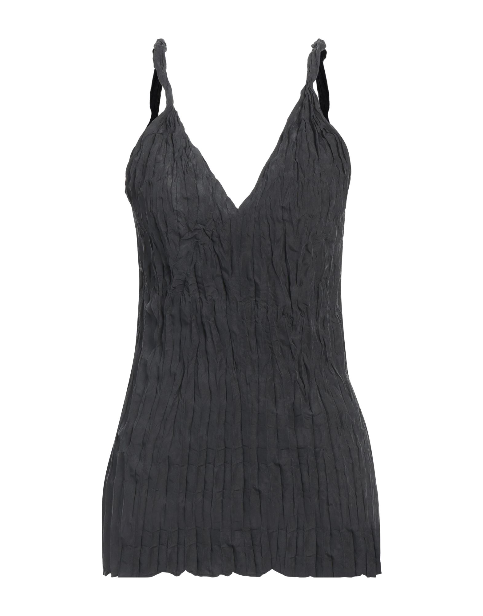 저지 소재의 V넥 슬리브리스 탑. 앞면에 플리츠를 잡아 하단이 세미 플레어 라인으로 마감됨.