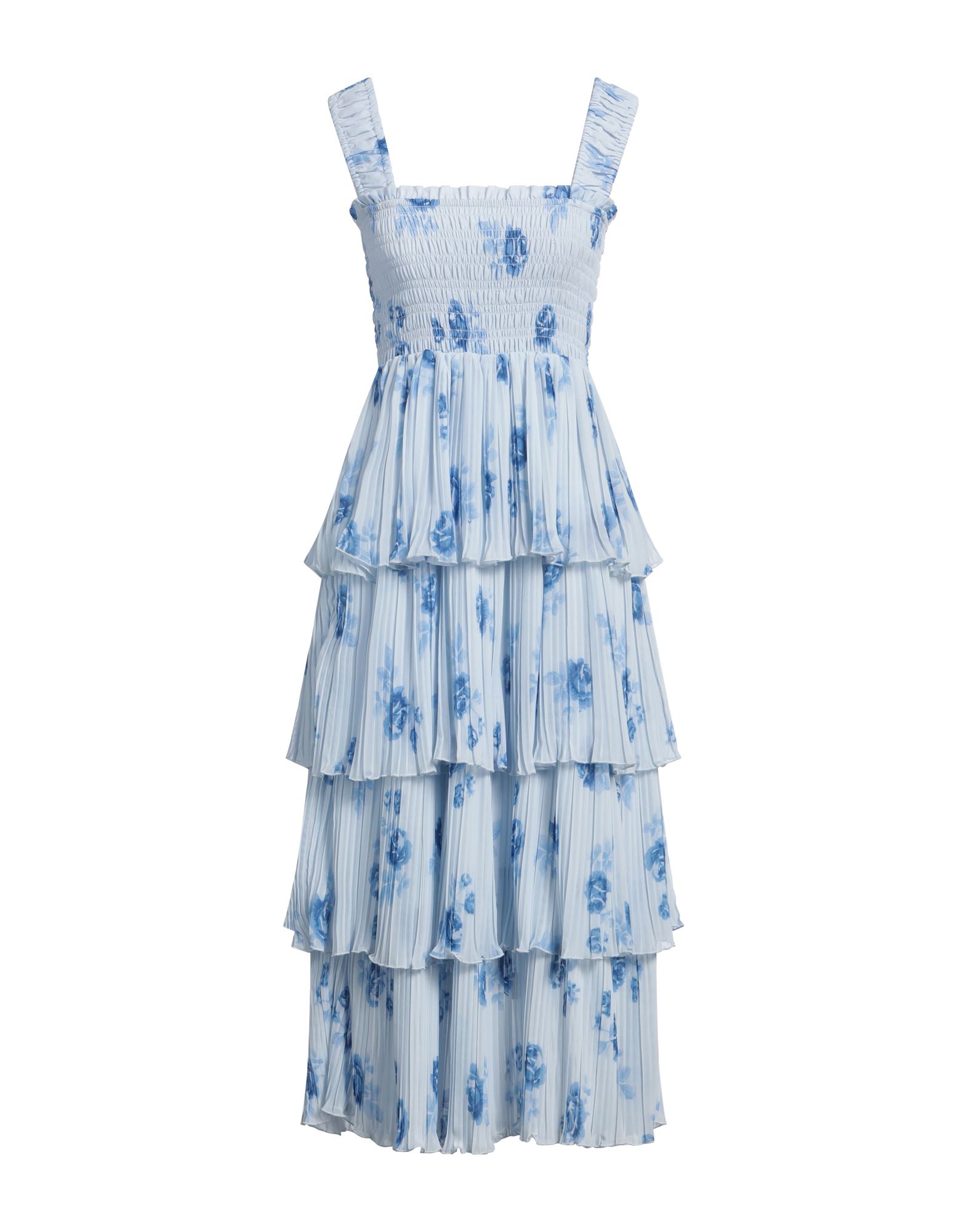 우븐 소재의 맥시 플레어 드레스. 스트레이트 네크라인. 어깨 스트랩을 상단에서 묶는 스타일. 등 부분이 가늘게 밴딩처리됨. 주름을 잡아 풍성함을 더한 티어드 스타일.