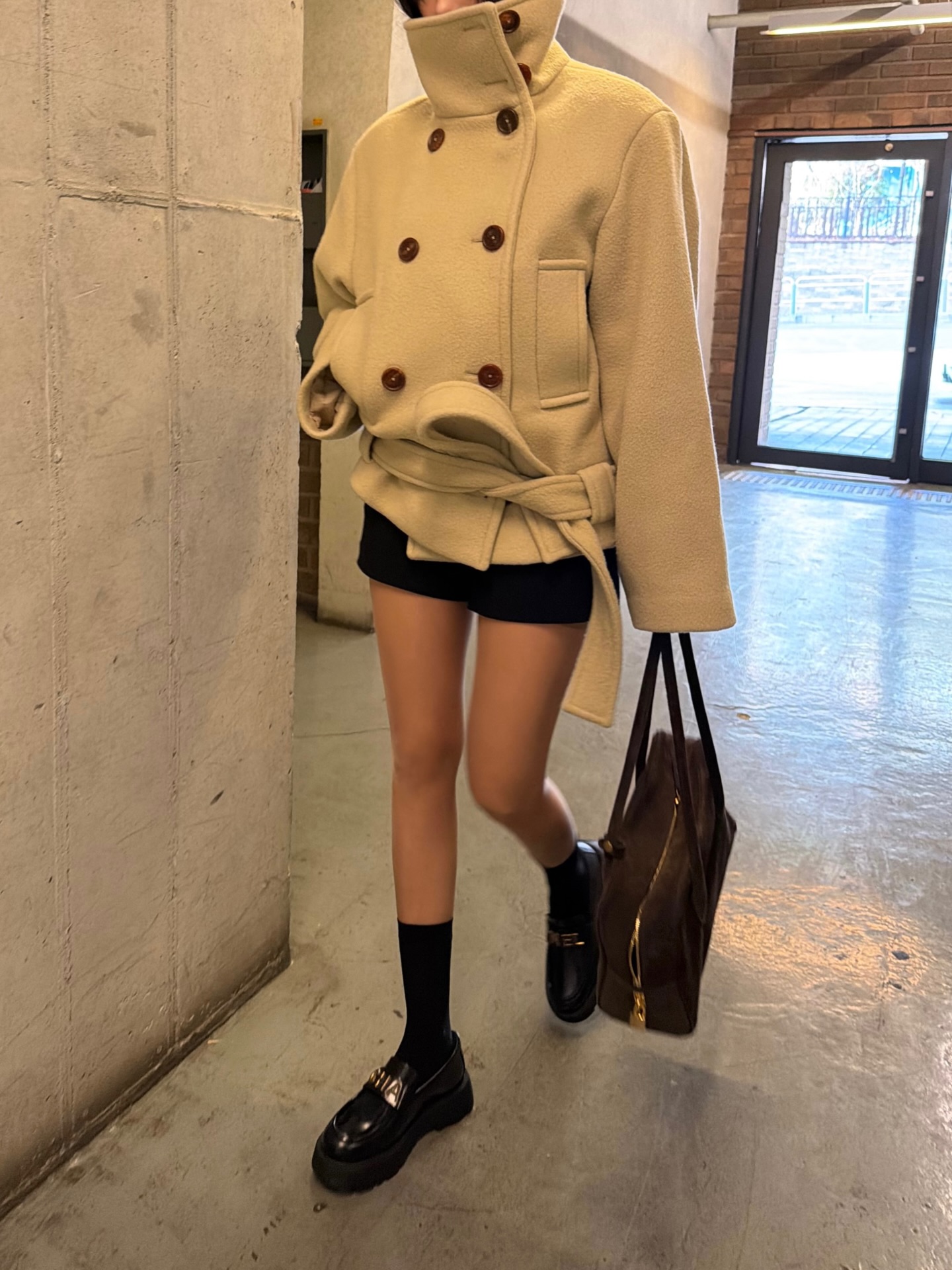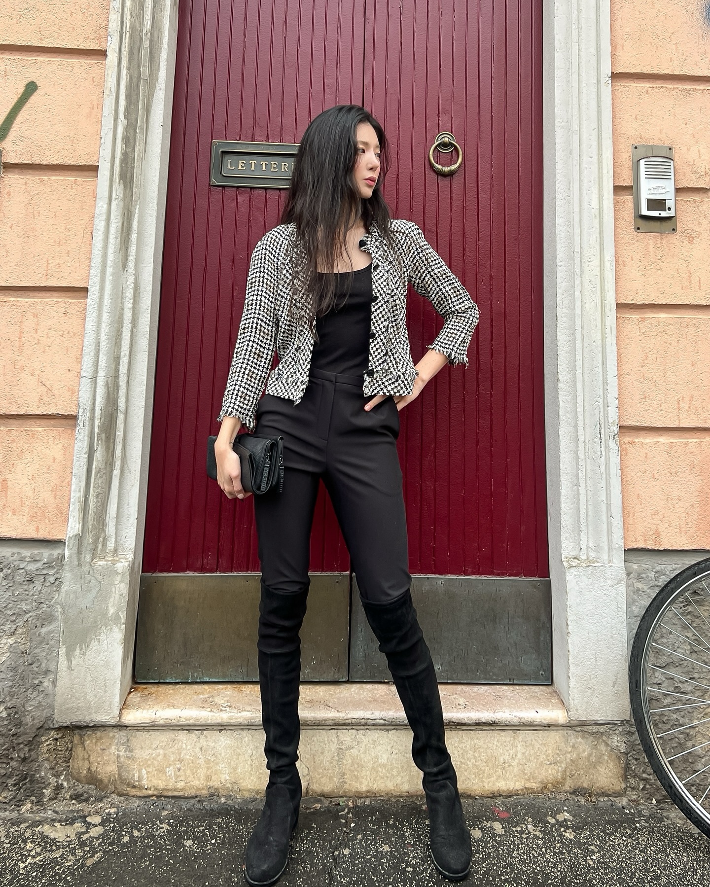 부클 트위드 울 소재의 라운드 넥 자켓입니다. 체스트 포켓과 웰트 포켓 디테일이 더해져 실용성을 더했는데요. 제니는 올블랙 룩에 바부슈카를 더해 미니멀한 무드를 완성했습니다.