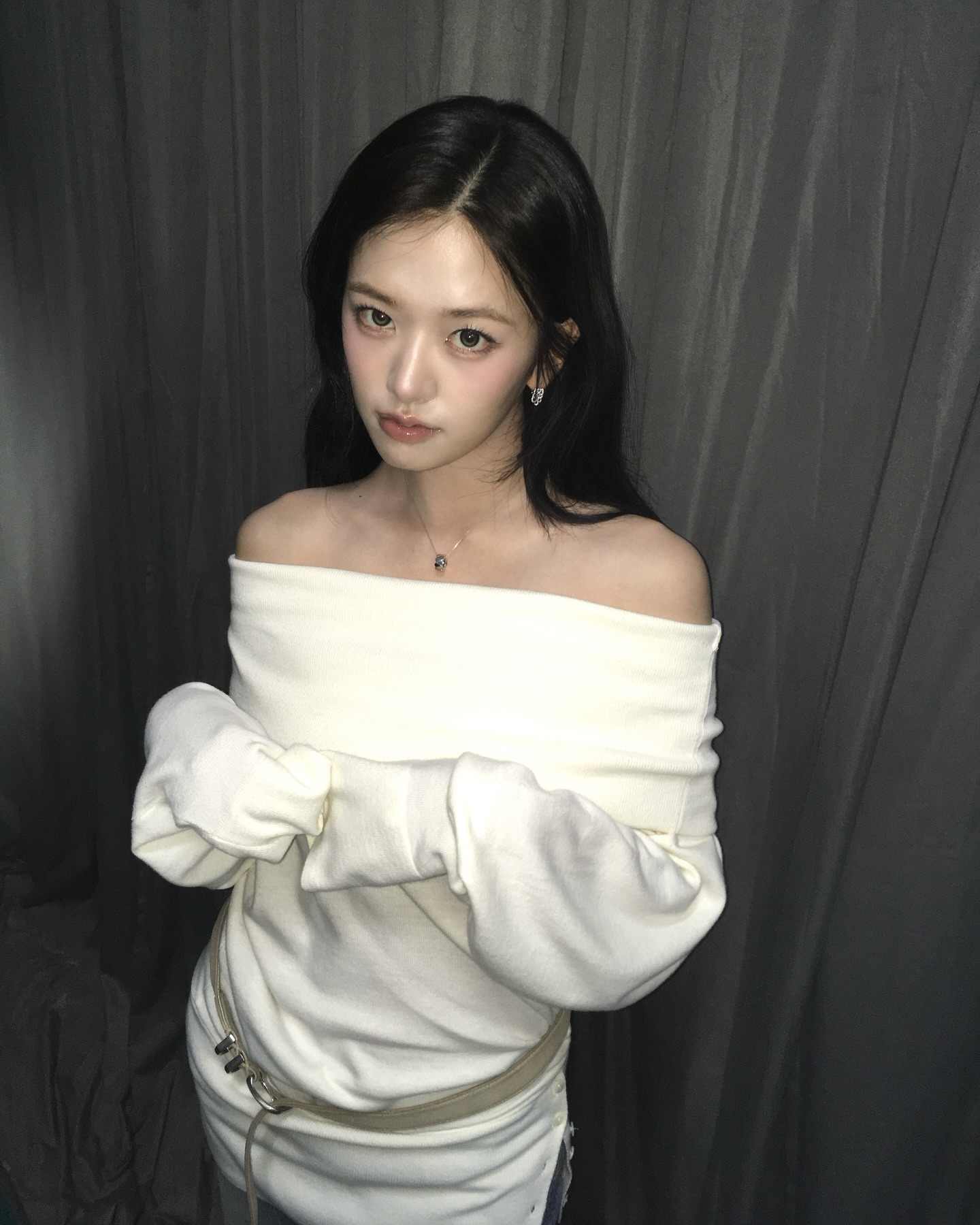 신시아가 착용한 크로셰 오픈 워크 모헤어 스웨터 앞쪽은 깊은 둥근 네크라인, 뒤쪽은 V라인으로 파여 있는 디자인으로, 허리 술 장식 조임끈이 더해진 것이 특징이죠. 원피스처럼 단독으로 입고 허리 라인을 살리면, 페미닌한 무드를 연출할 수 있습니다.